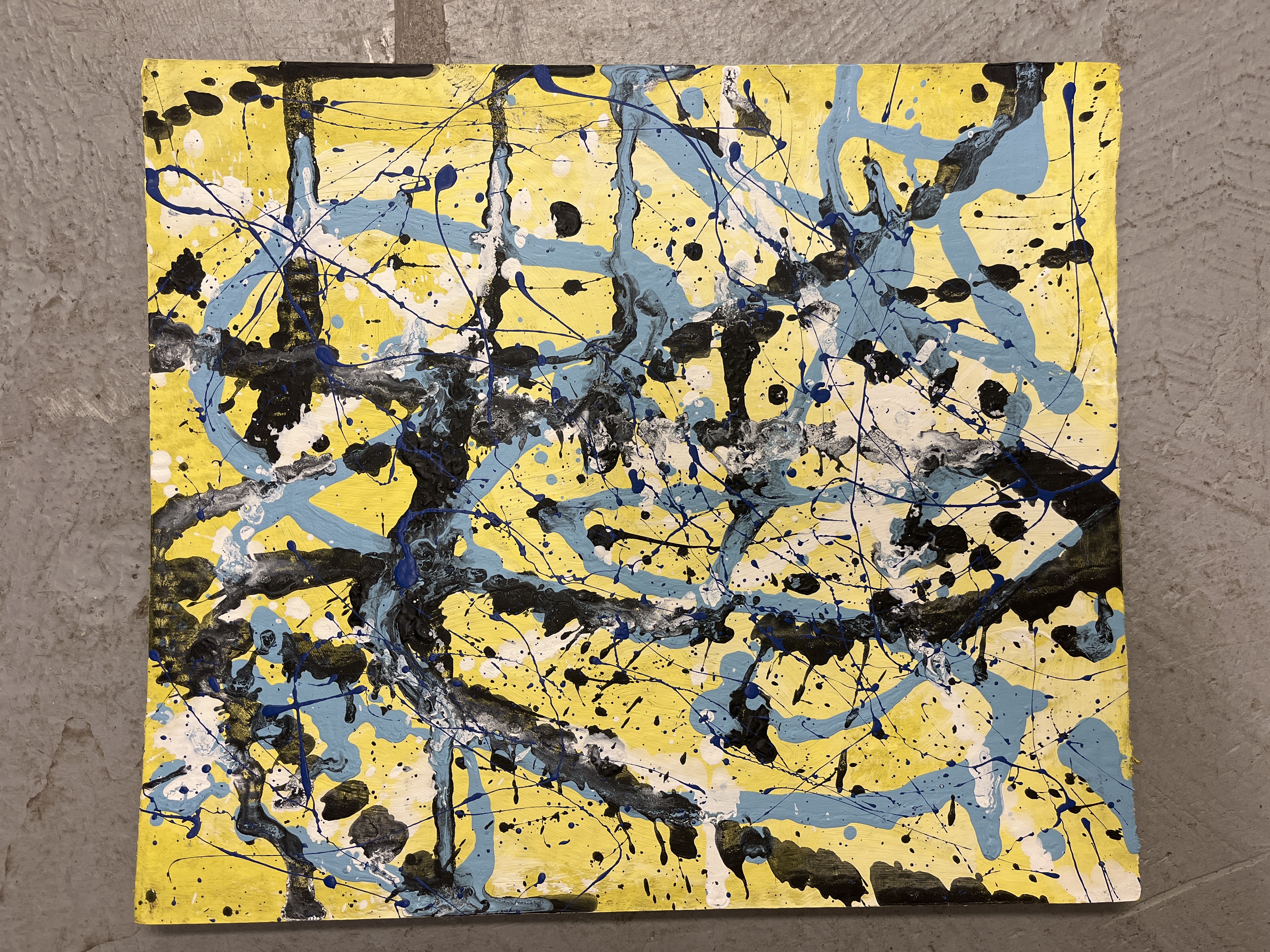 - abstract dark blue splatter over black and white splotchy lines on a yellow background