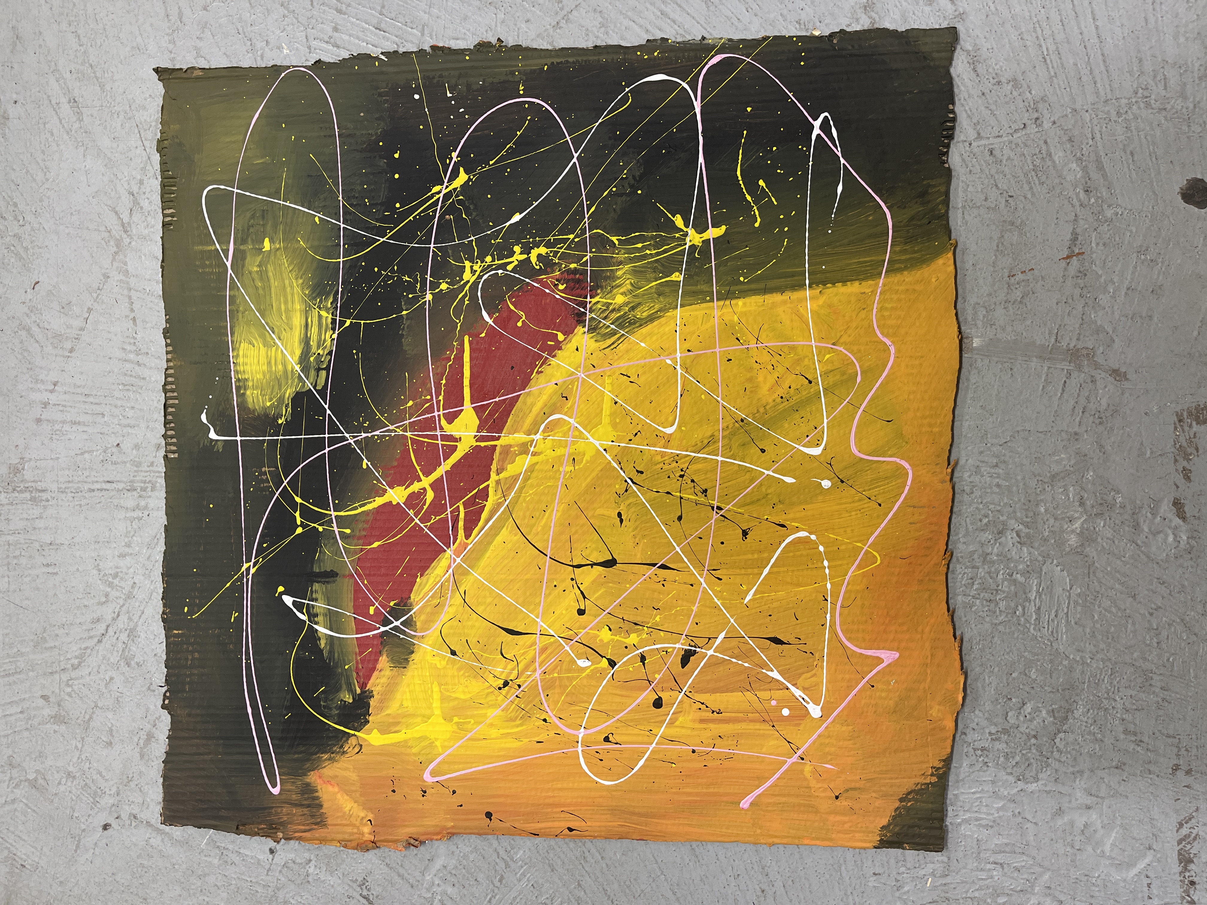 - abstract pink, yellow, black, and white splatter on a yellow, red, and black background