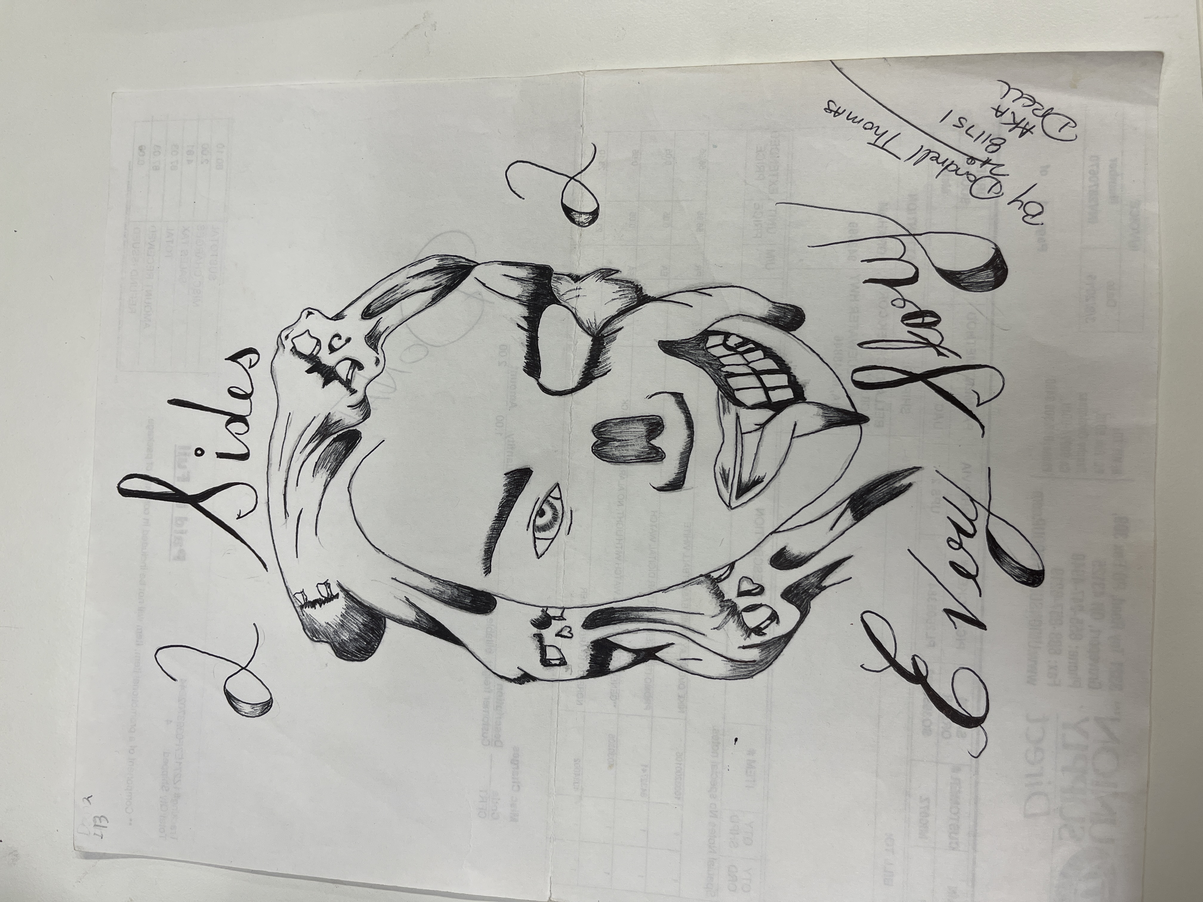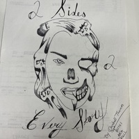 - ink drawing of a woman's face that is half skeleton surronded by the words '2 Sides 2 Every Story'