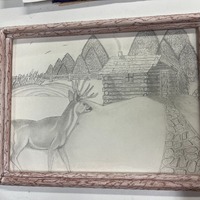 - framed graphite drawing of a deer looking at a cabin surrounded by trees.