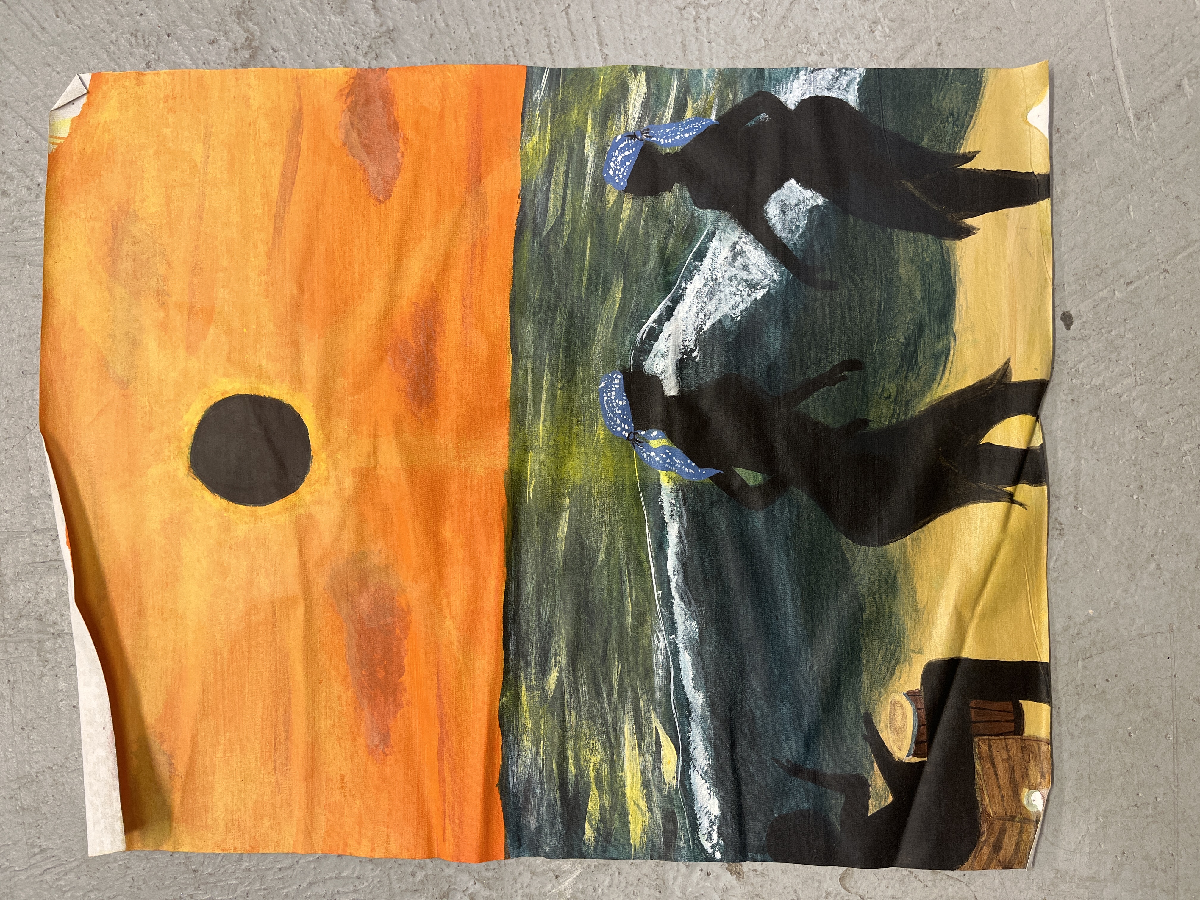 - a landscape with a sunset on the water with two women dancing and one woman playing a drum in the foreground
