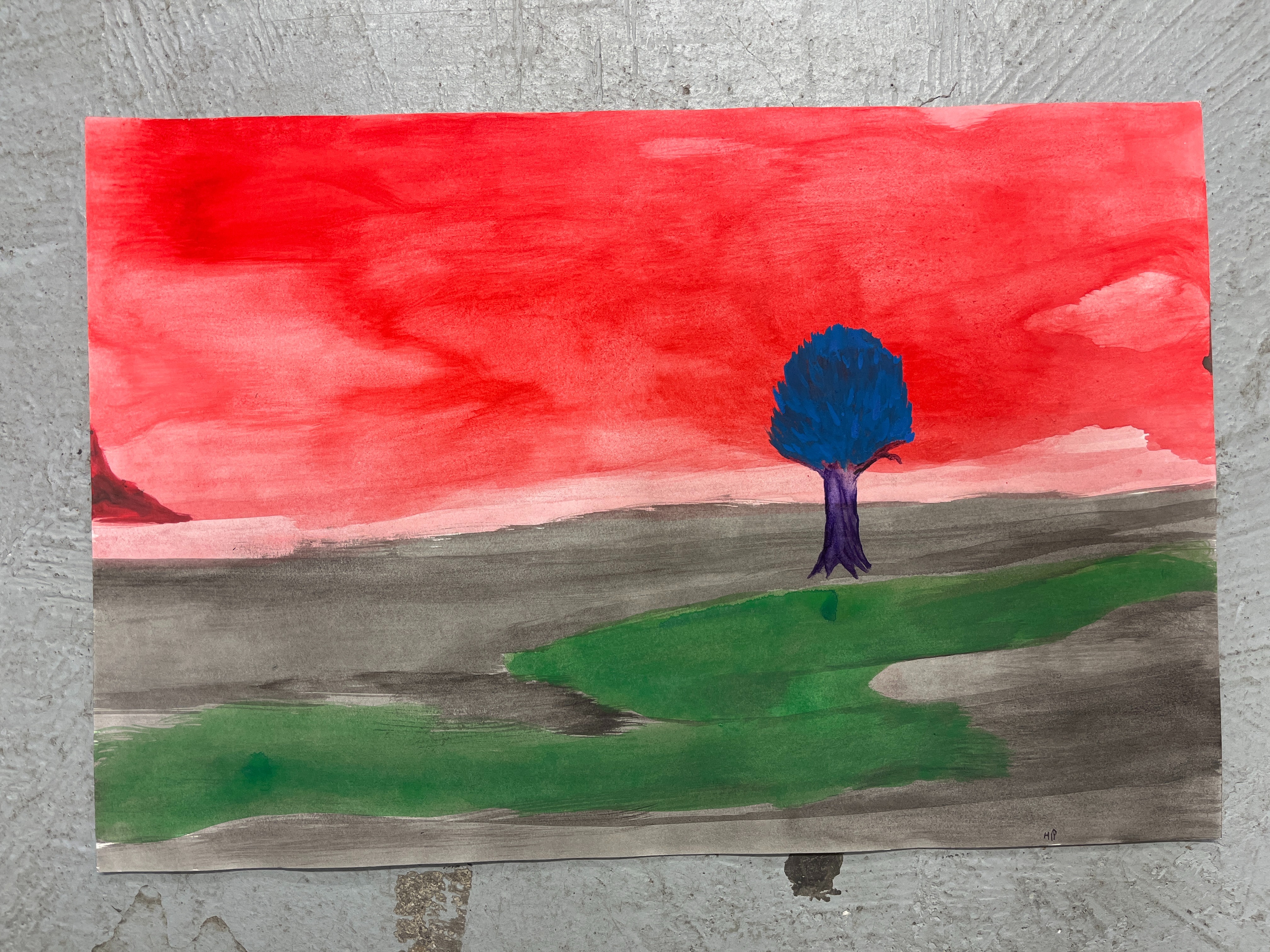 - landscape with red sky, black and green ground and a purple tree right of center