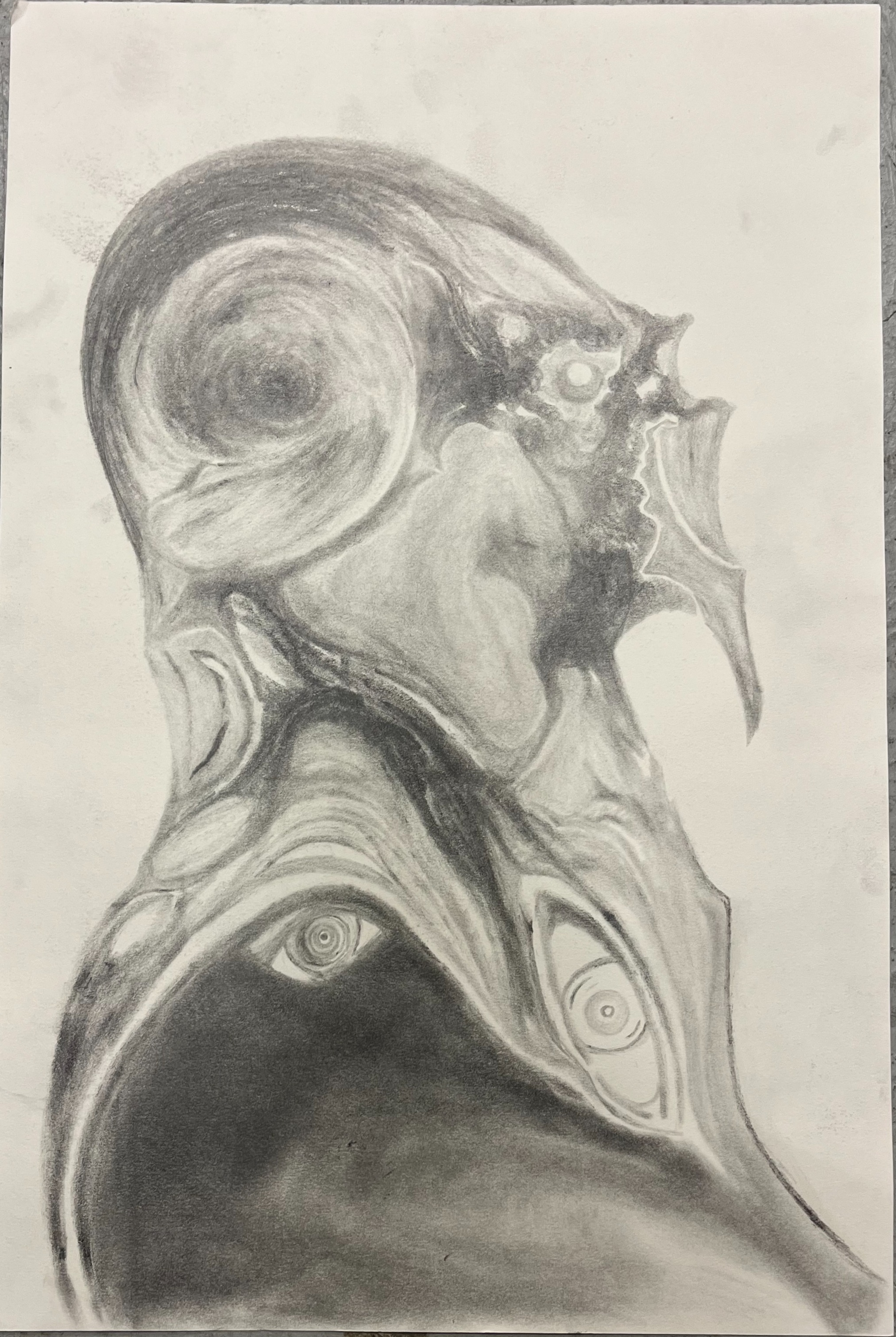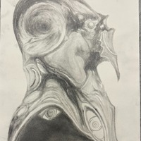 - alien, abstract, portrait, figurative, surrealist, two dimensional, drawing, pencil, cosmic
