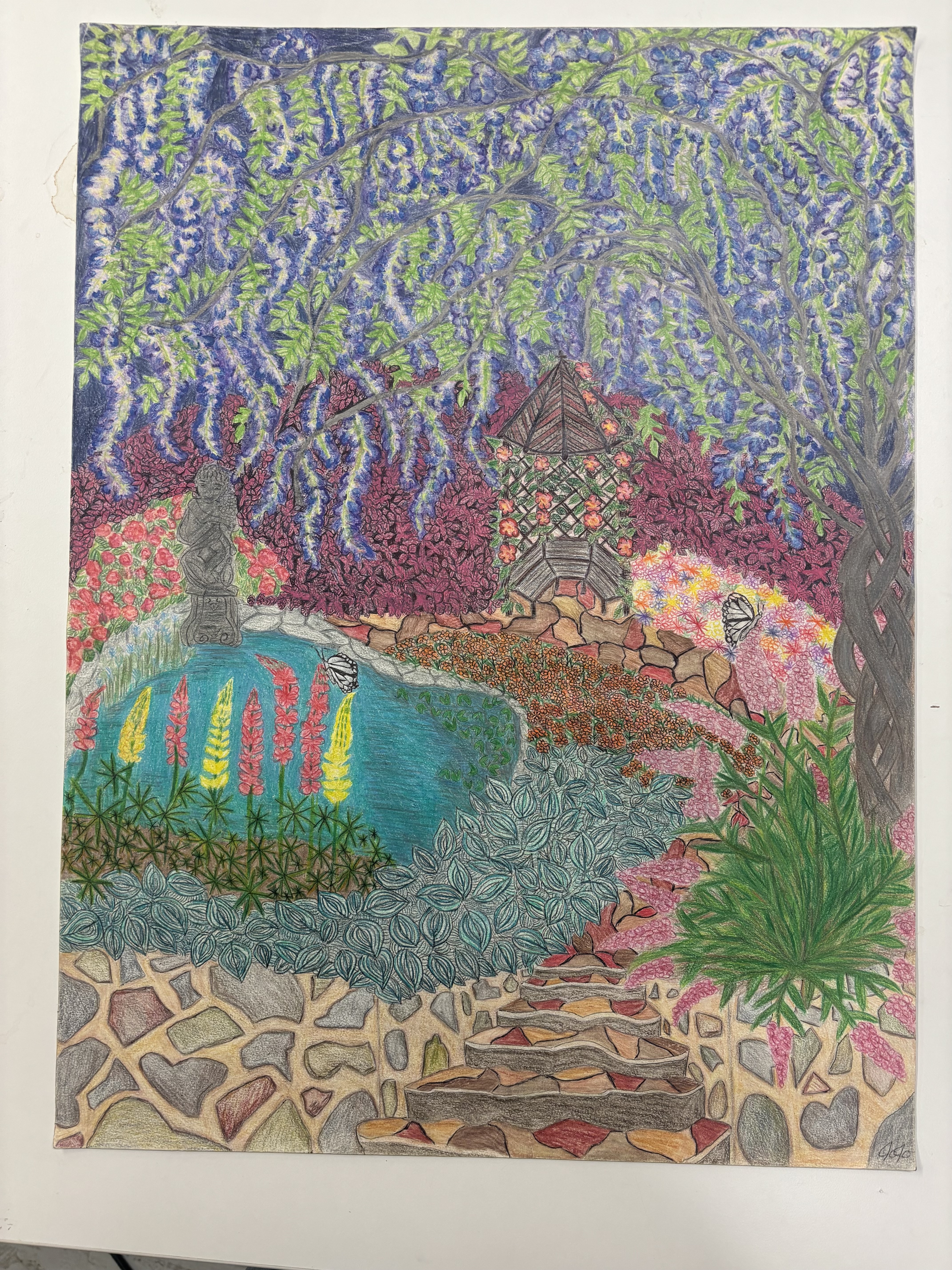- representational, two dimensional, drawing, colored pencil, flowers, nature