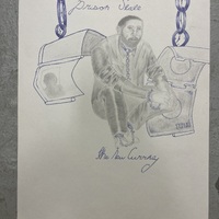 - representational, two dimensional, text, drawing, pencil, pen, pain, people, men, money, time, symbolism, sadness, incarceration, prison, prison time
