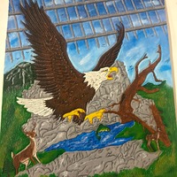 - eagle flying over a landscape with trees, rocks, and water inclosed by a cage