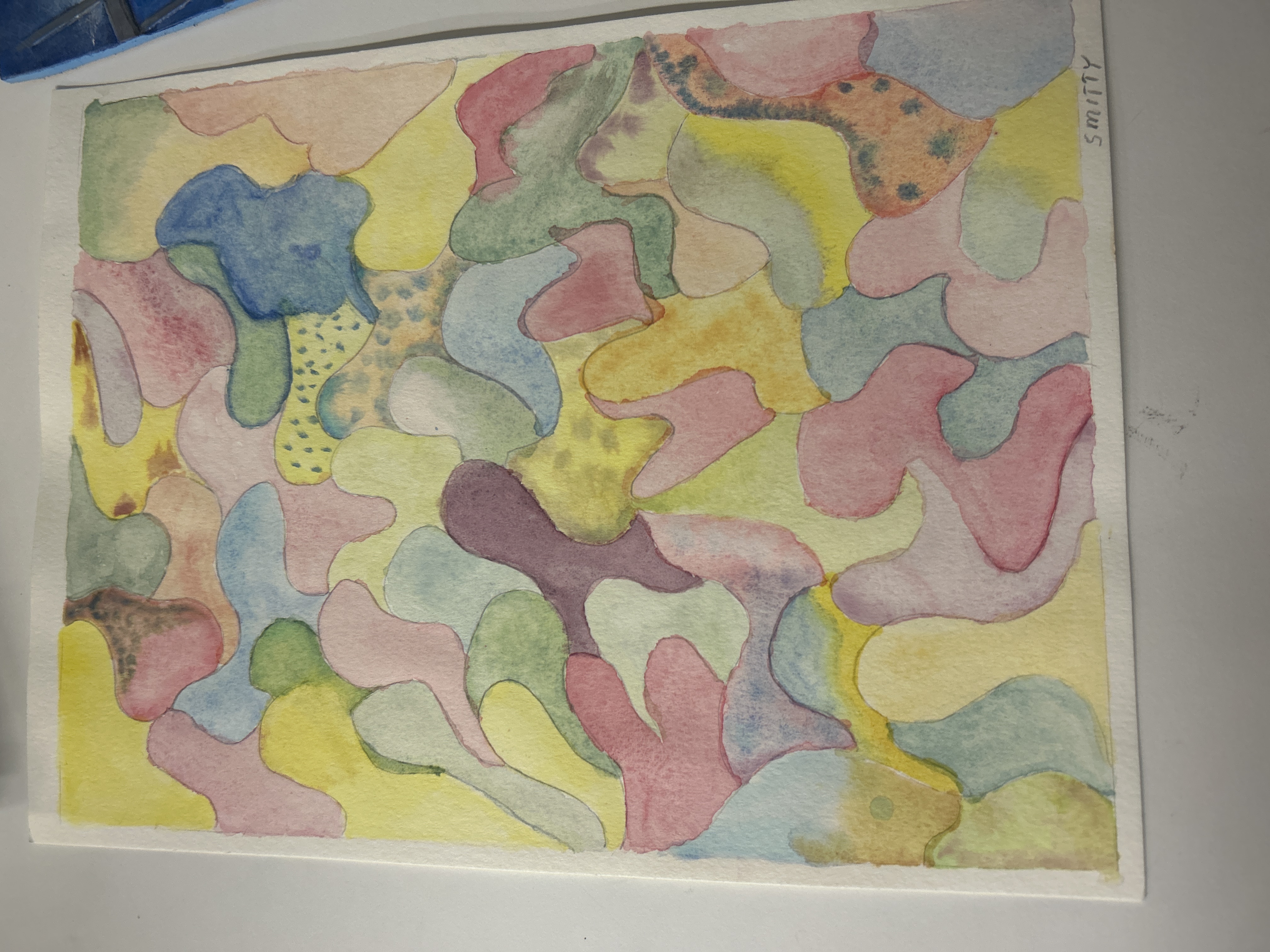 - watercolor rounded abstract shapes in yellow, blue, pink, green, and purple (some have dots)