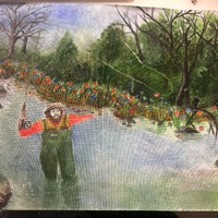 - landscape, representational, two dimensional, painting, paint, flowers, forest, nature, recreation, fishing, water, men