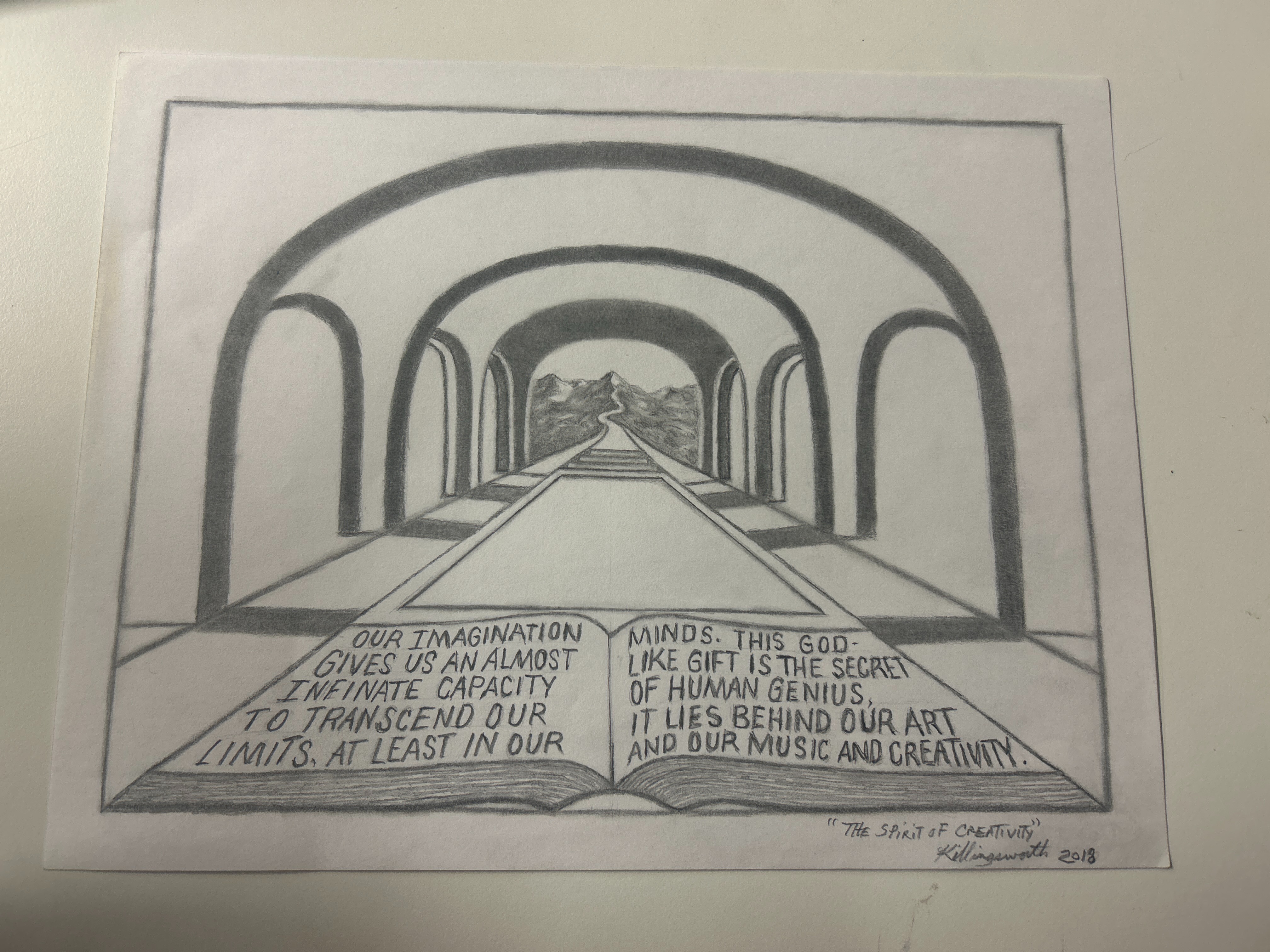 - book saying 'Our imagination gives us an almost infinate capacity to transcend our limits. At least in our minds. This God-like gift is the secret of human genius. It lies behind our art and our music and creativity.' in an area with arch ways leading towards a mountain in the background