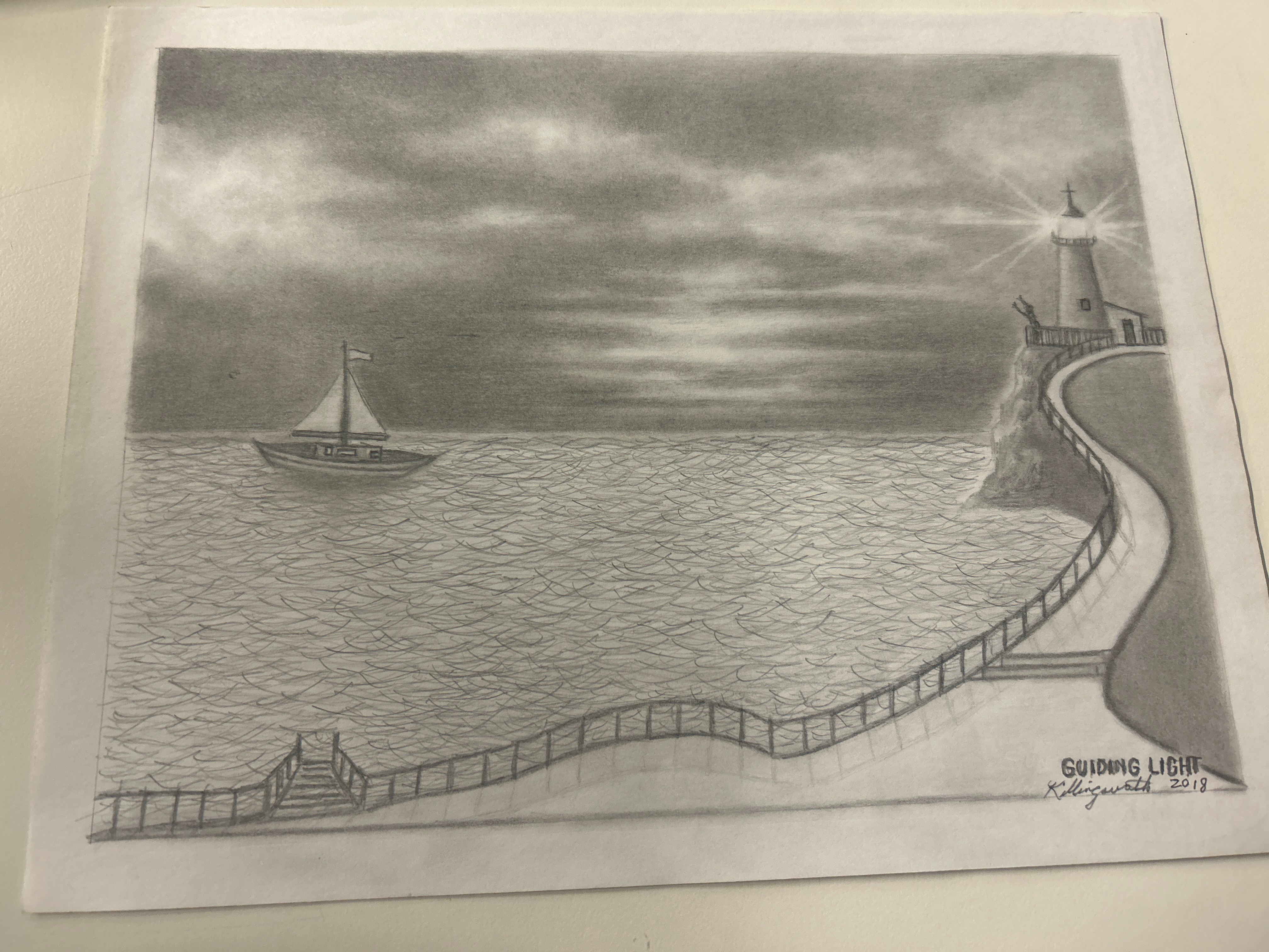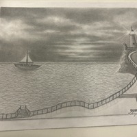 - drawing, pencil, representational, two dimensional, nature, water, seascape, lighthouse