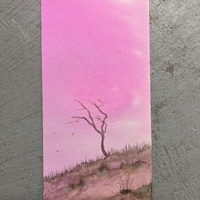 - a desolate watercolor landscape with a tree with no leaves on a pink sky