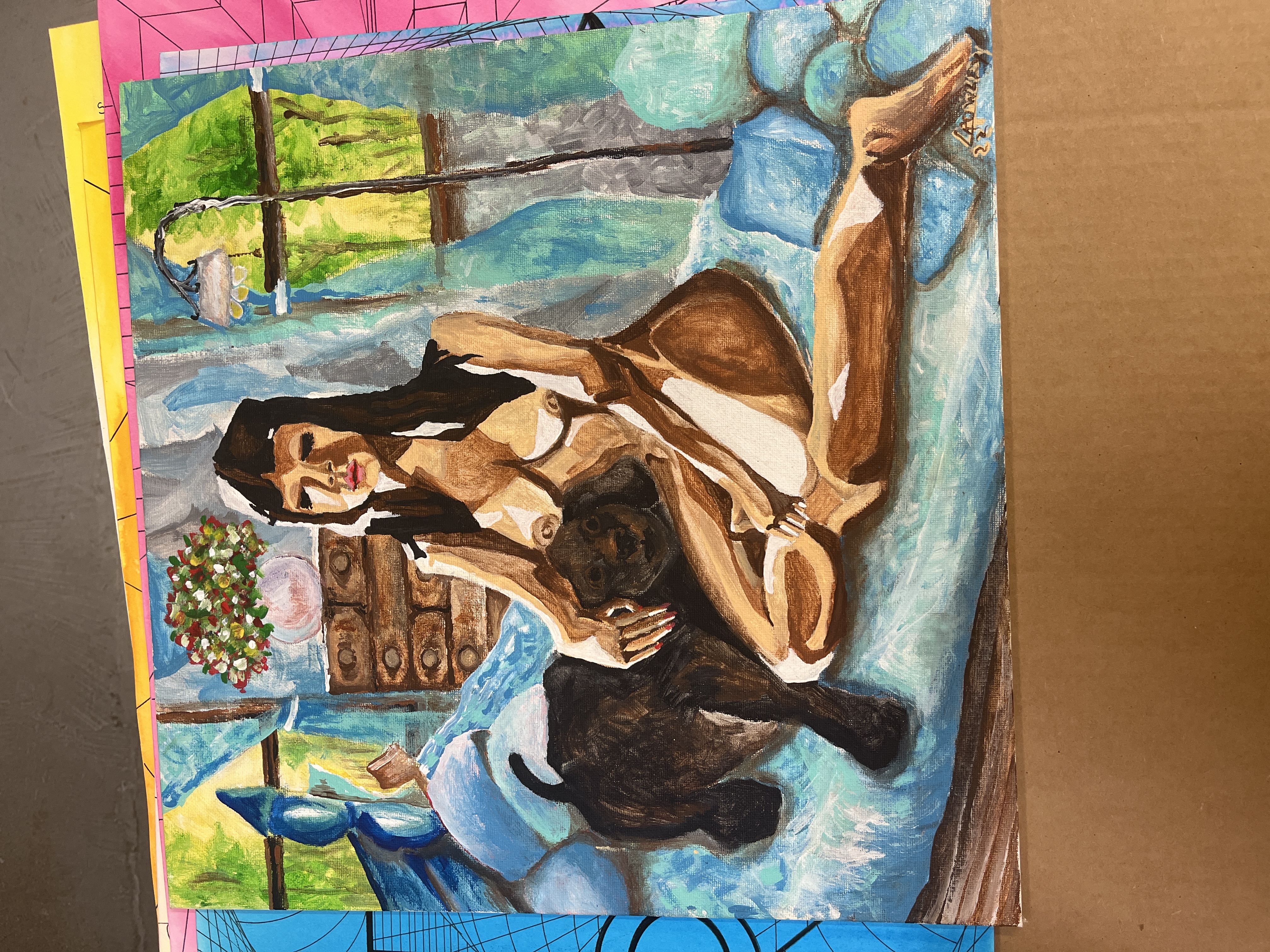- abstract painting of a nude woman with. abrown dog siting on a blue bed