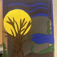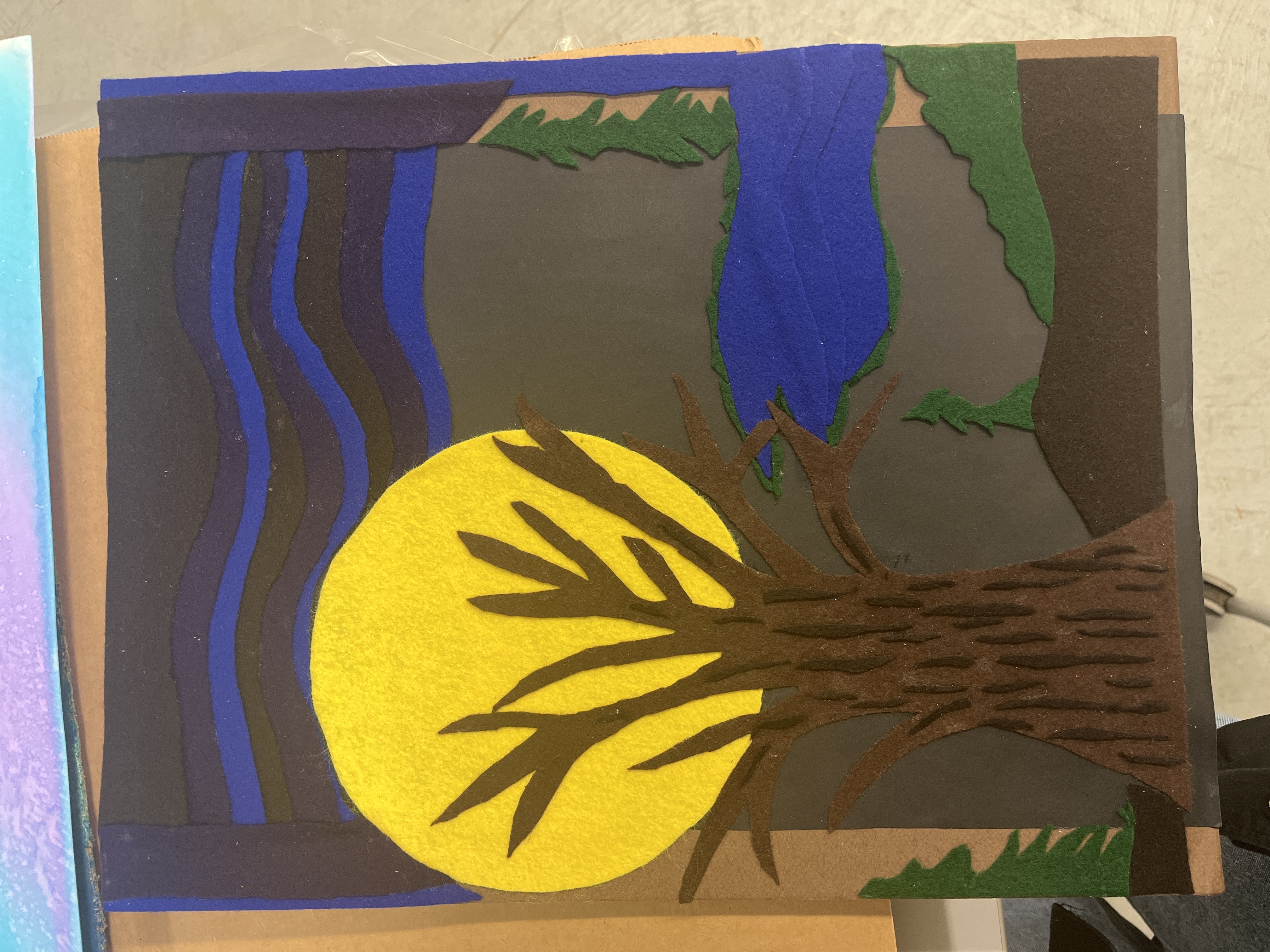 - felt landscape with water, small trees, a large tree with no leaves and a moon