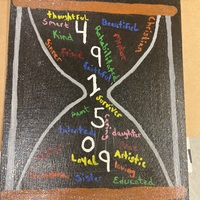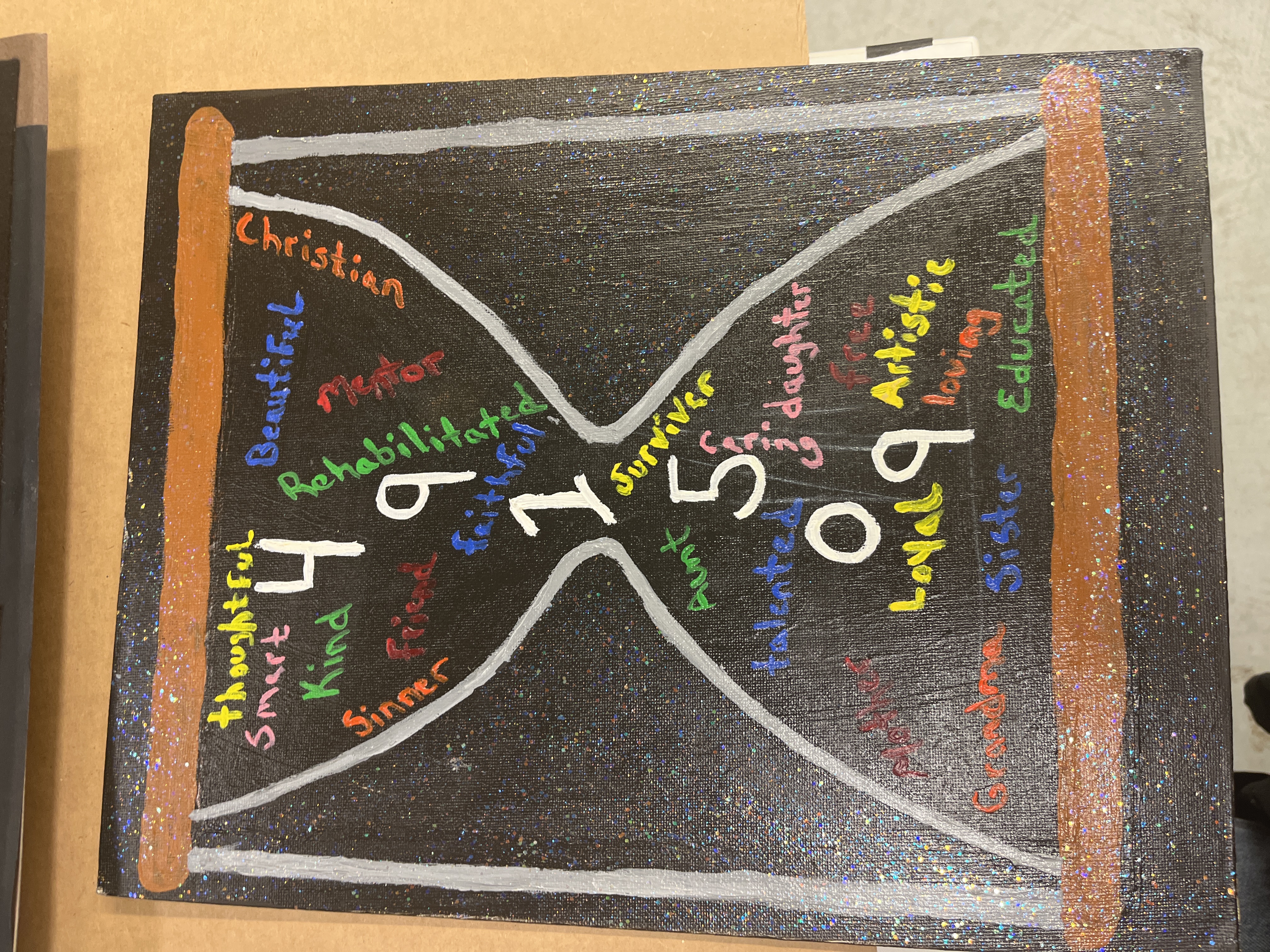 - hourglass with MDOC# vertically and multicolored adjectives inside including 'thoughtful, faithful, artistic, loving, daughter, talented, and sinner'