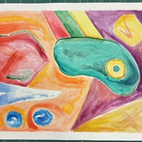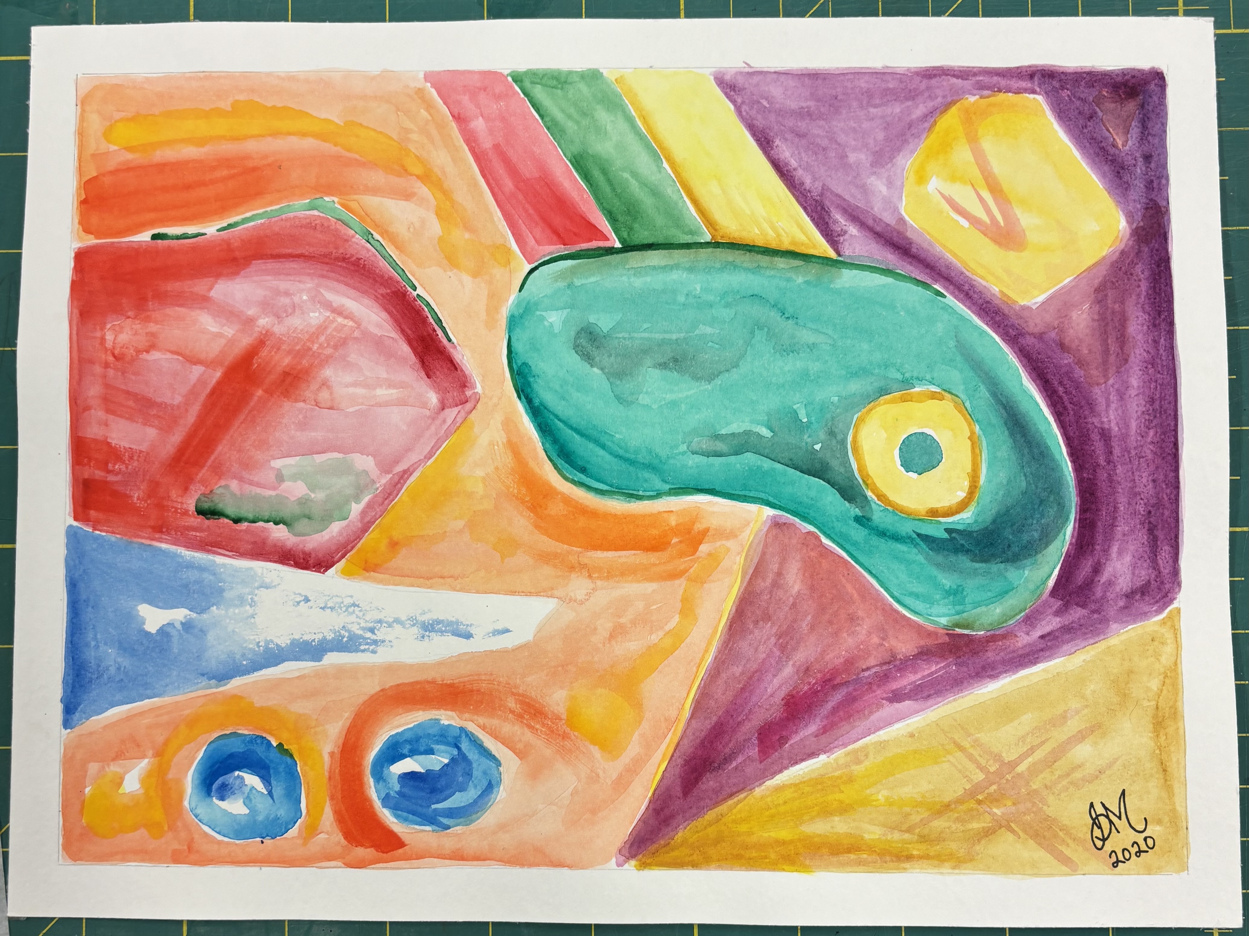 - abstract multicolored shapes including a green bean shape with a yellow and blue dot, two blue dots, and a blue triangle