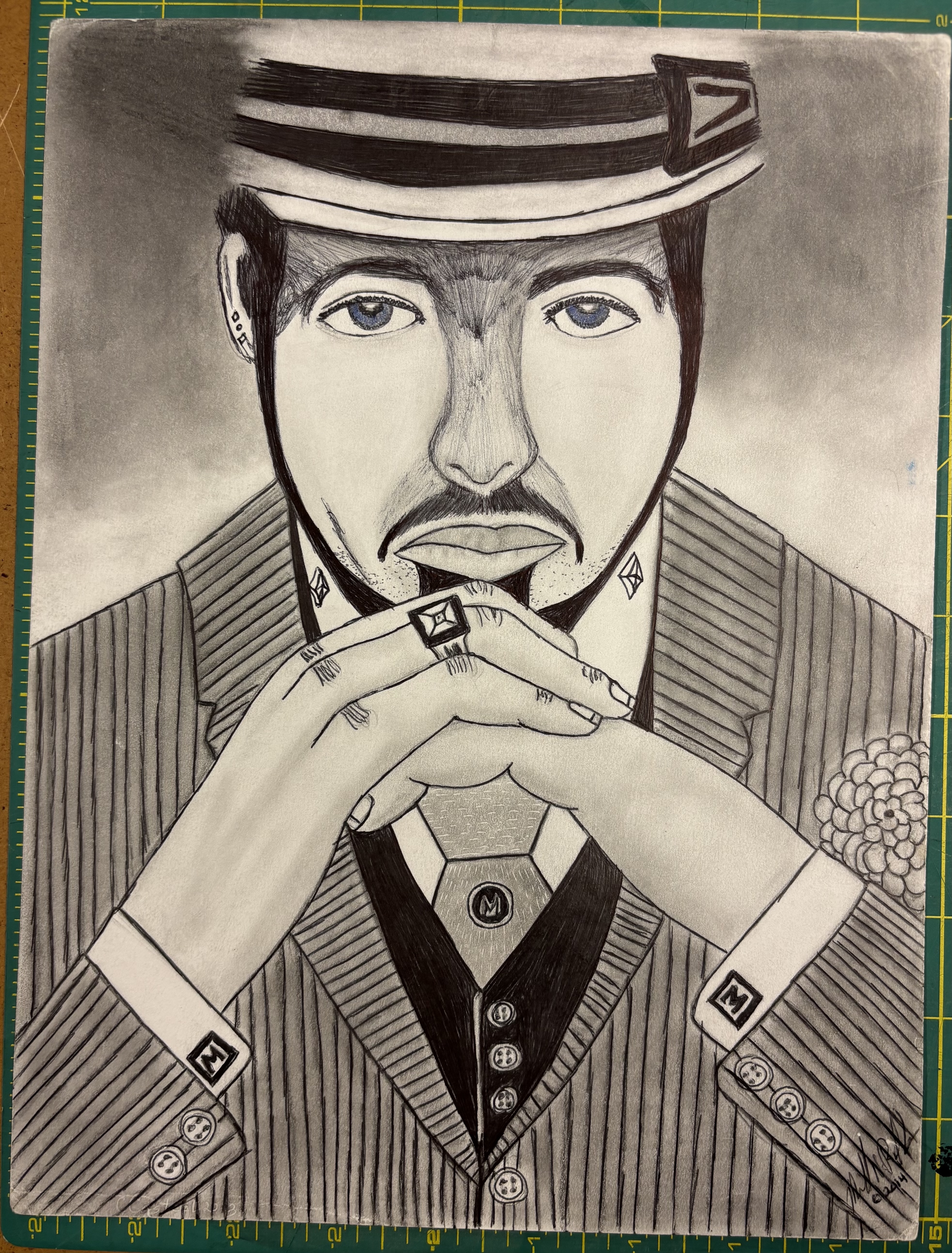 - graphite man wearing a hat and pinstriped three peice suit with hands folded