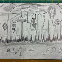 - city skyline with cemetary in foreground and faces and words 'death' and 'lost souls' floating with faces