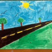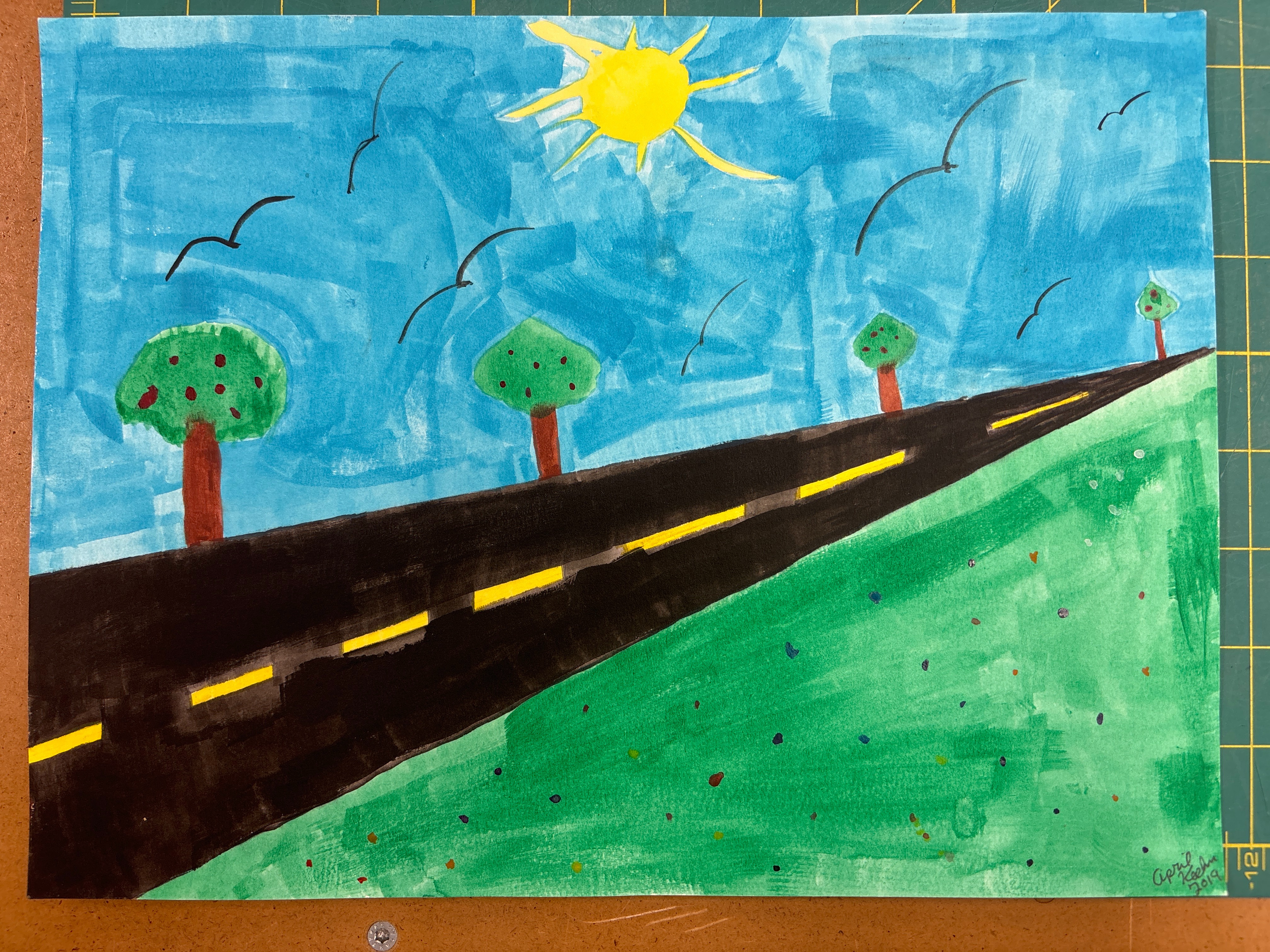 - diagonal road with trees lining it behind green grass and in front of a blue sky with the sun and birds