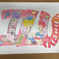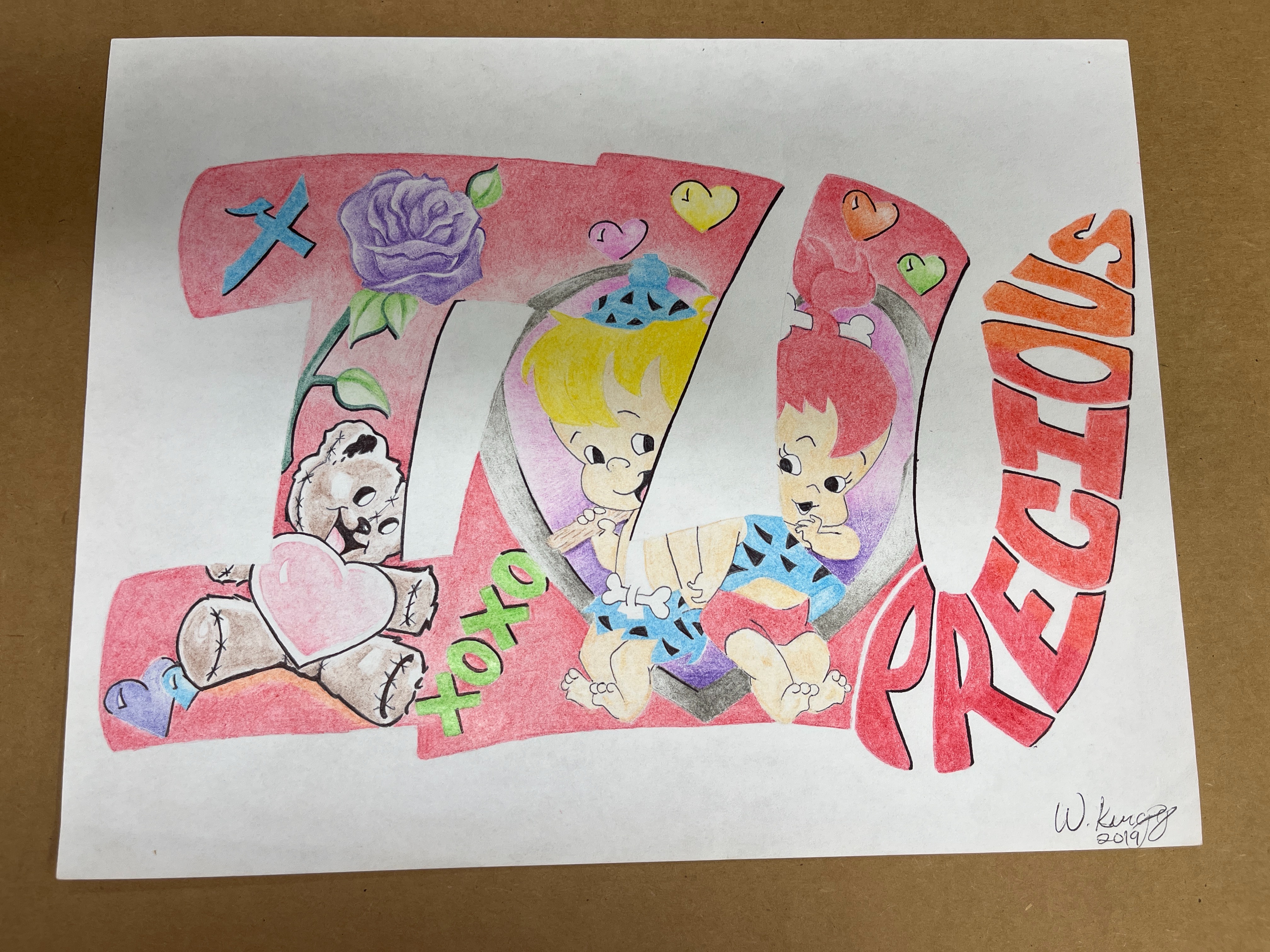 - ILU' in red, inside is design with Flinstones, a rose, hearts, and 'precious'