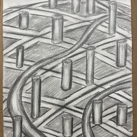 - pattern with cylinders standing inbetween square paths and a line snaking through