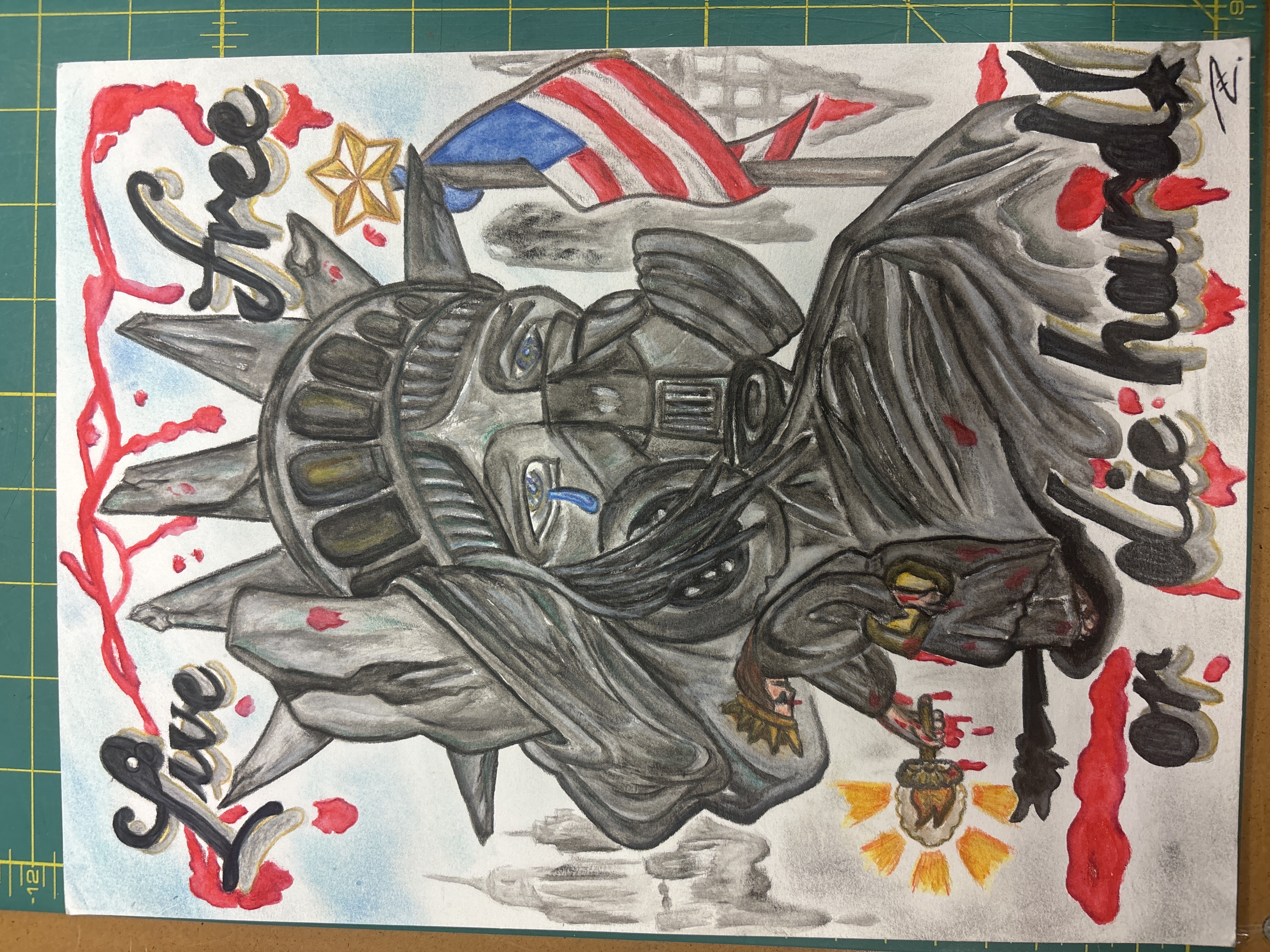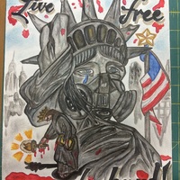 - statue of liberty with gas mask in front of New York skyline ane next to an american flag and a human statue of liberty holding torch low and bending over all surrounded by 'Live free or die hard!'