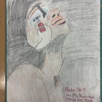 - drawing, colored pencil, text, religious, christian, sadness, women, figurative, portrait, representational, two dimensional