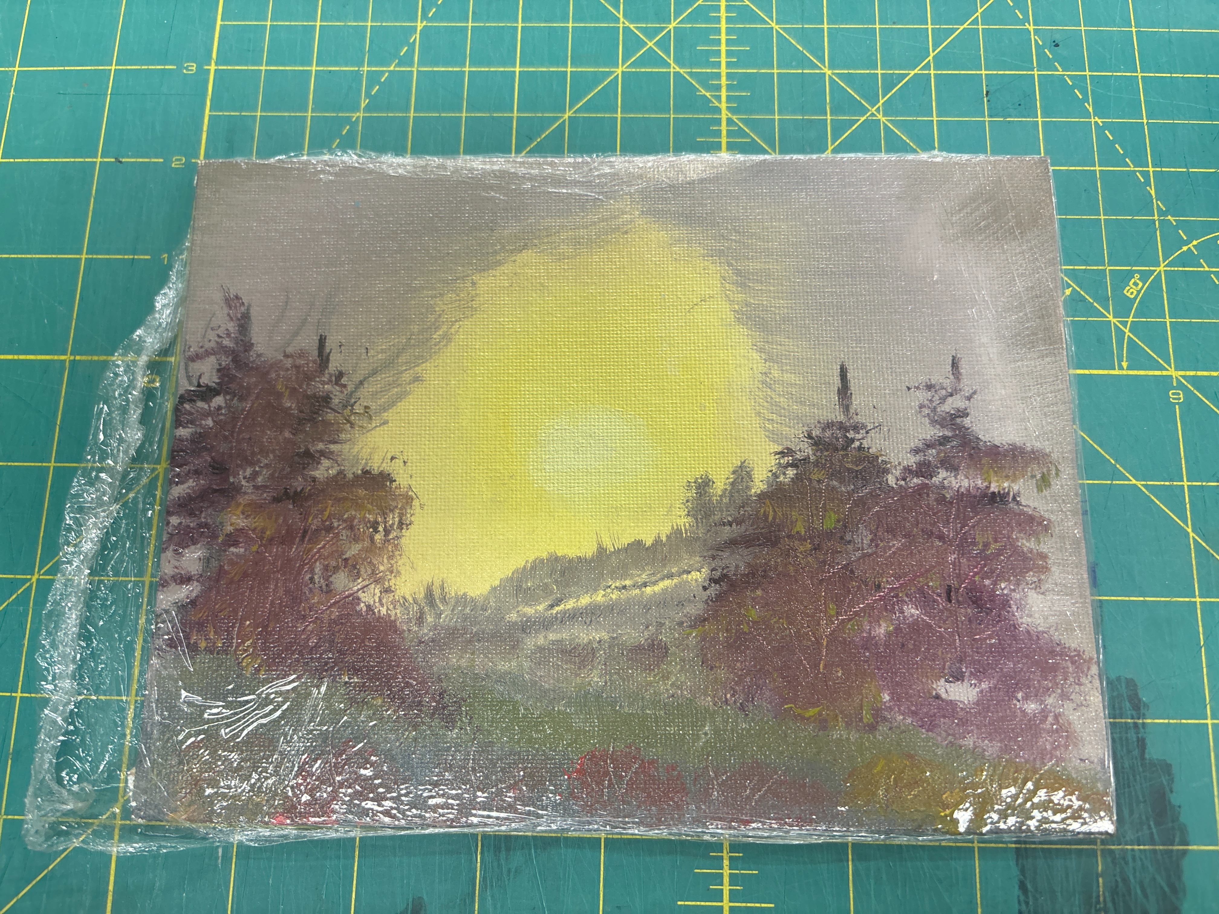 - sun coming up on grey sky with purply trees on both sides
