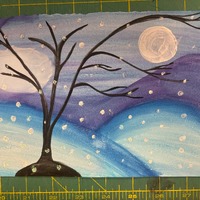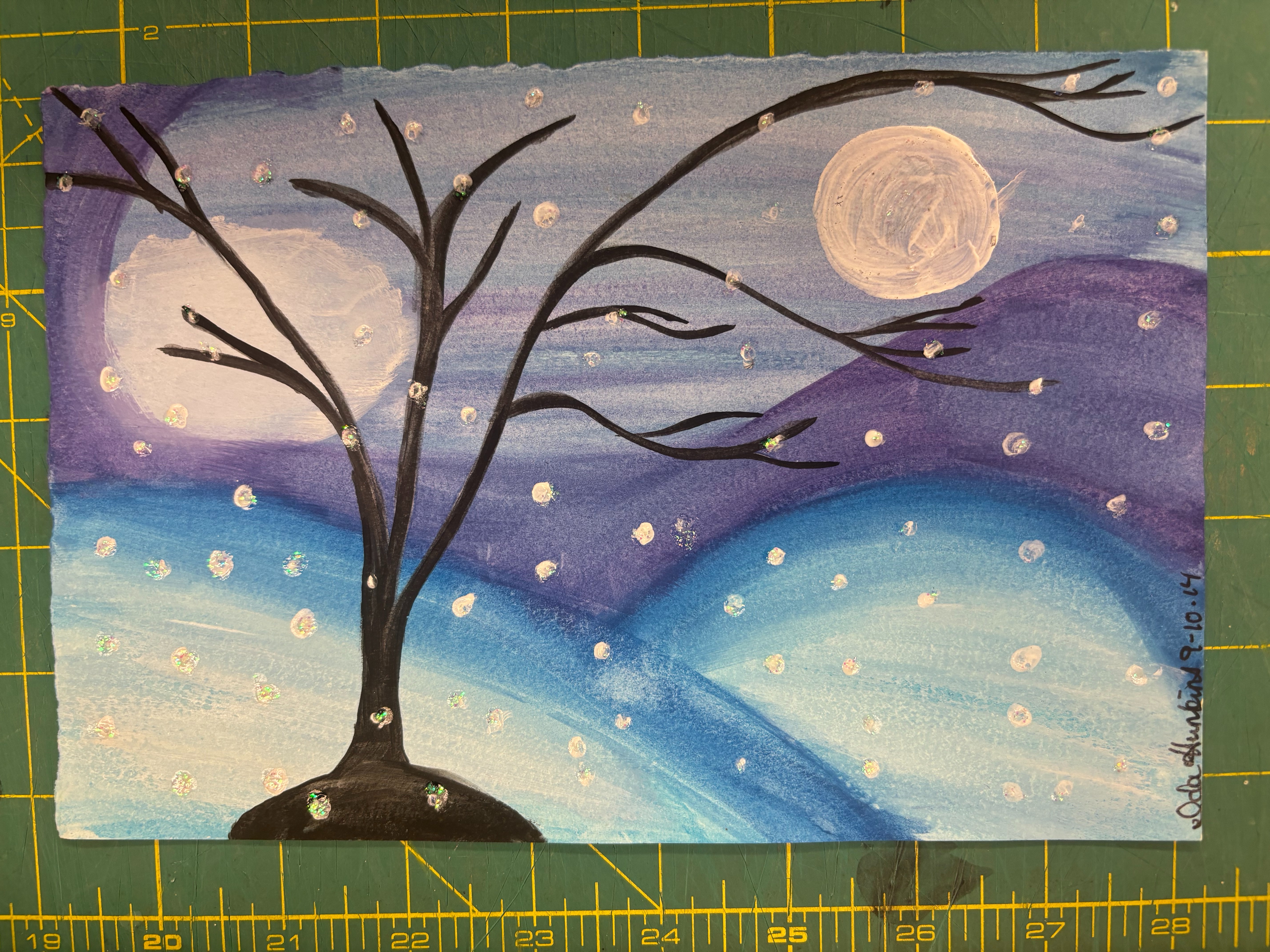 - black tree with no leaves on a blue and purple winter landscape with moon