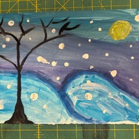 - black tree with no leaves on a blue and purple winter landscape with moon