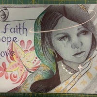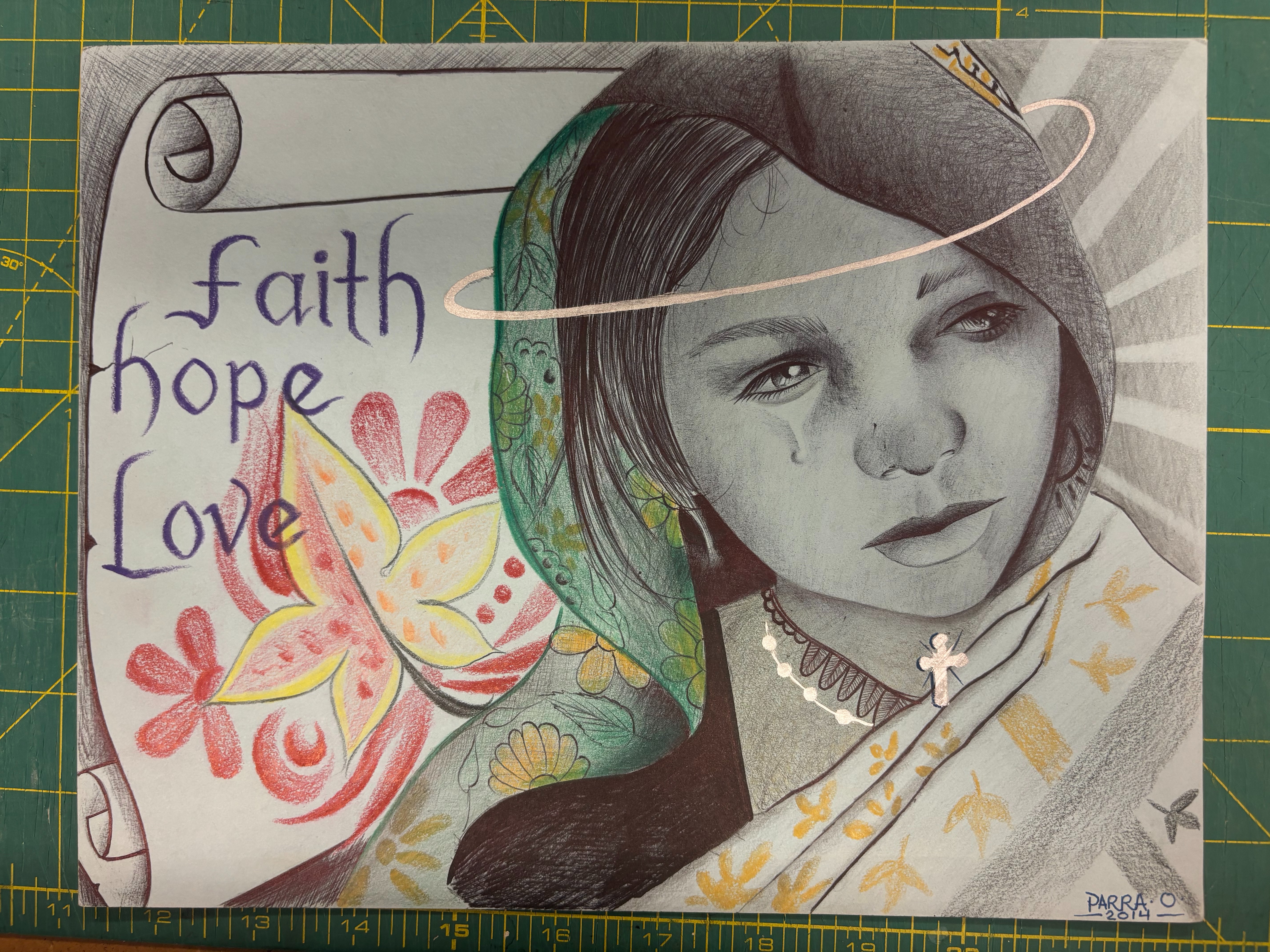- "faith hope love" next to a red and yellow flower design and next to a girl with a halo and a green headscarf crying