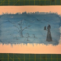 - woman in long black dress holding a crow in a cemetary with a large tree stump and mountains and a moon in the background - all washes with blue watercolor