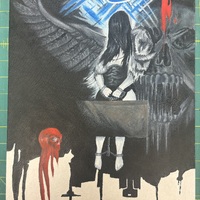 - female angel with hair covering face shackled in front of a large skull shadowed in the black background and a small red skull in foreground