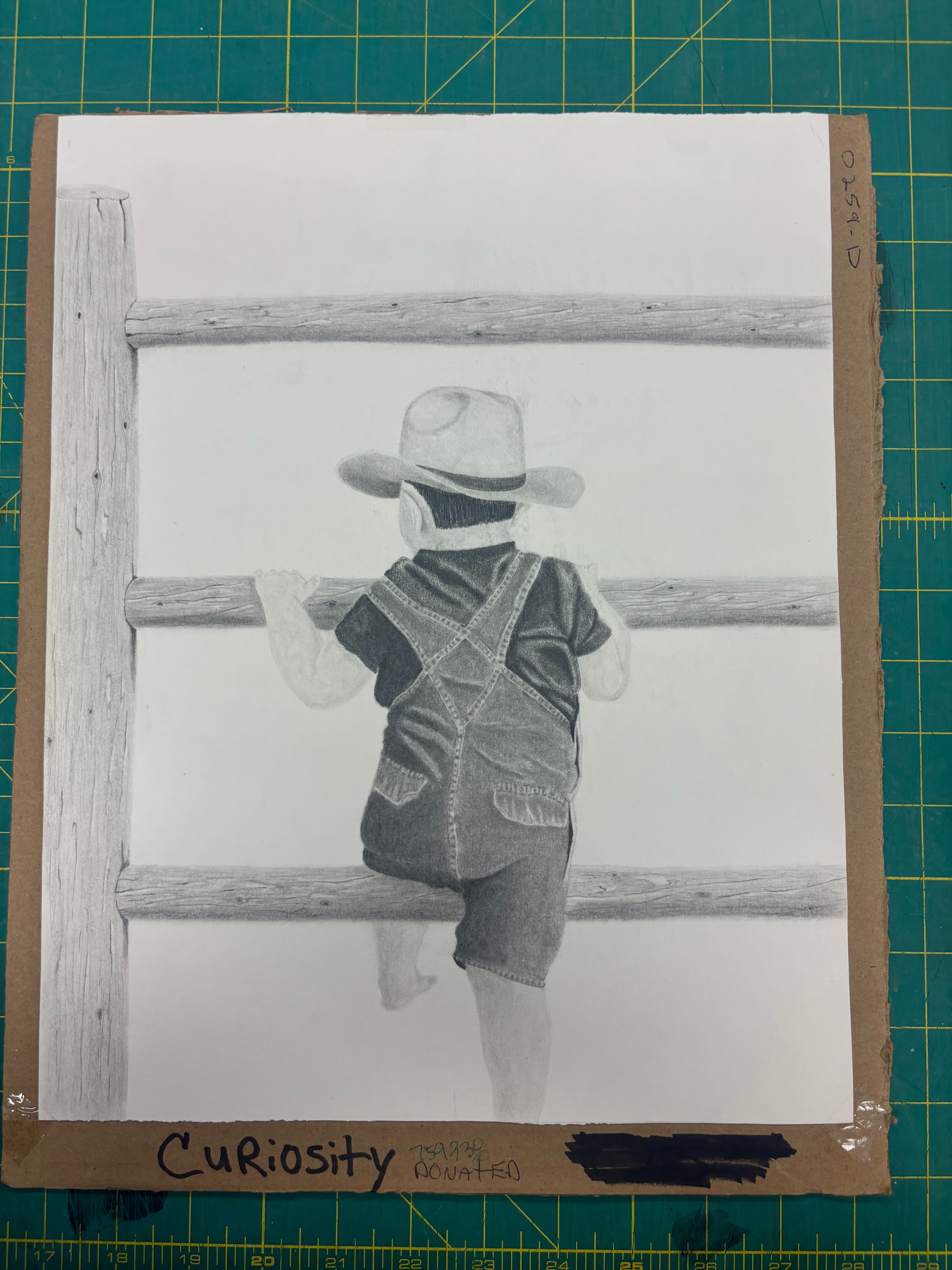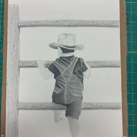 - little boy in overalls climbing through fence