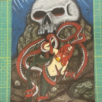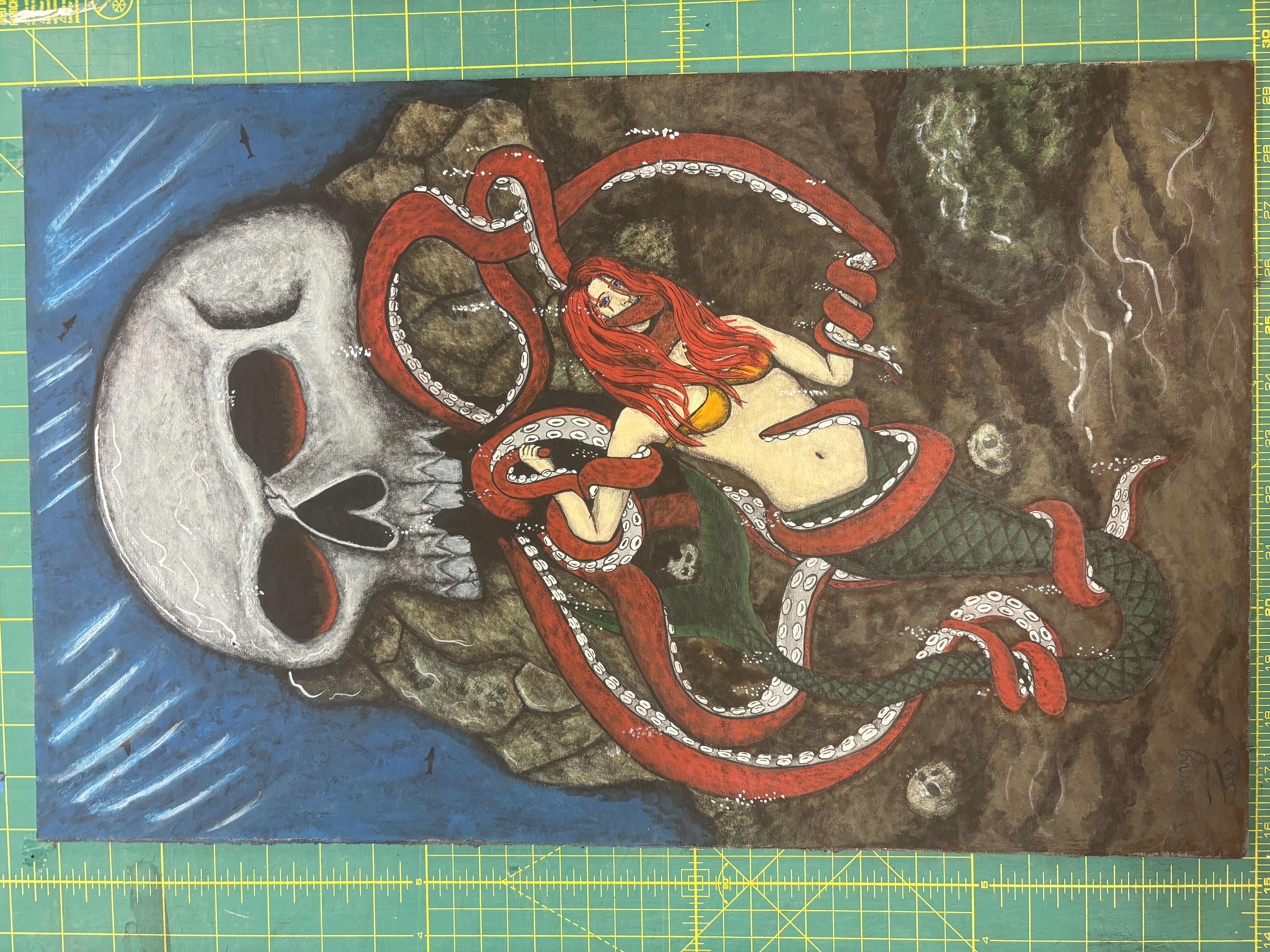 - painting, paint, representational, two dimensional, fantasy, women, skulls, monsters, mermaids, confinement