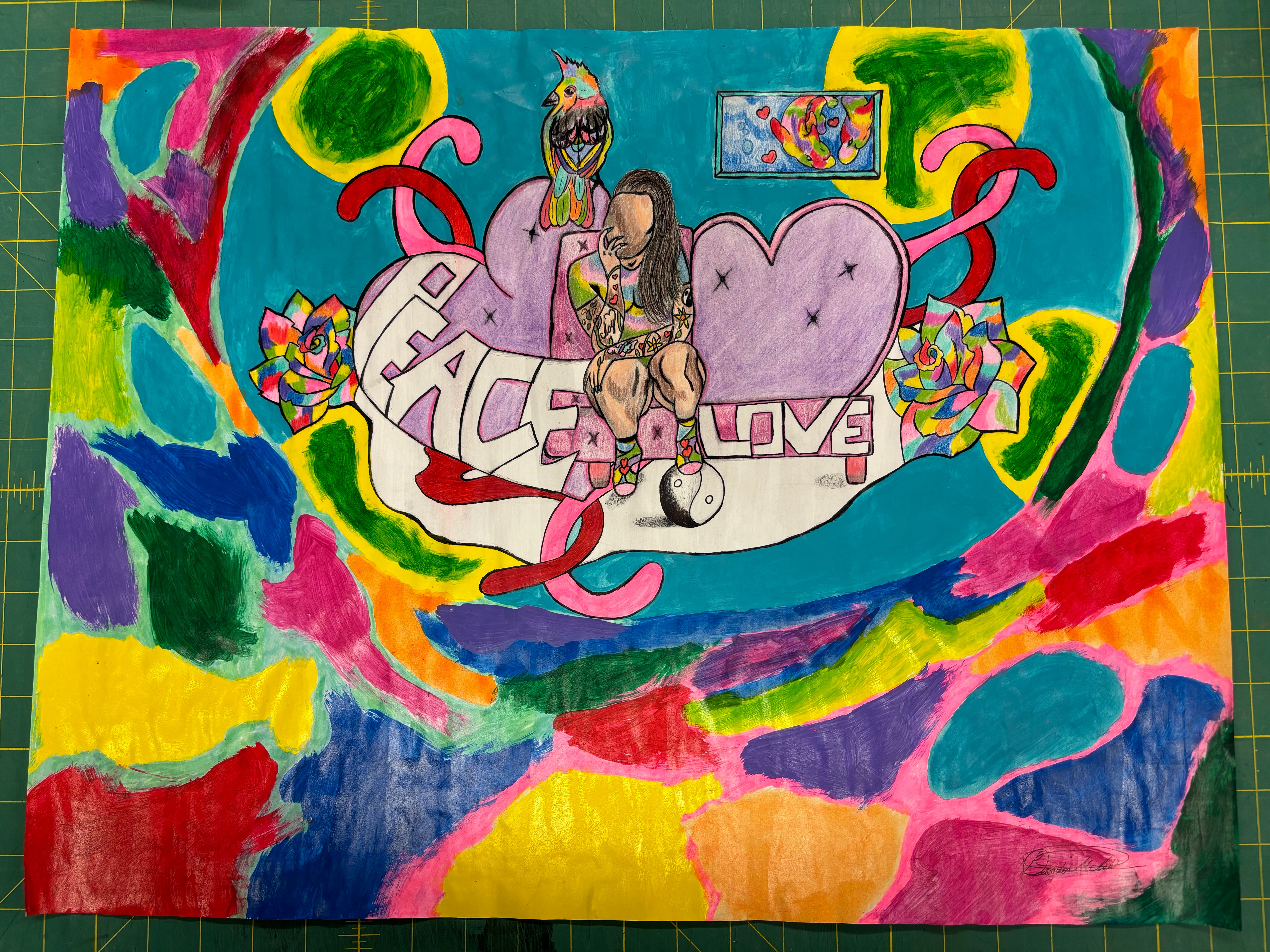 - woman on couch with words "PEACE LOVE" surrounded by multicolor splotches