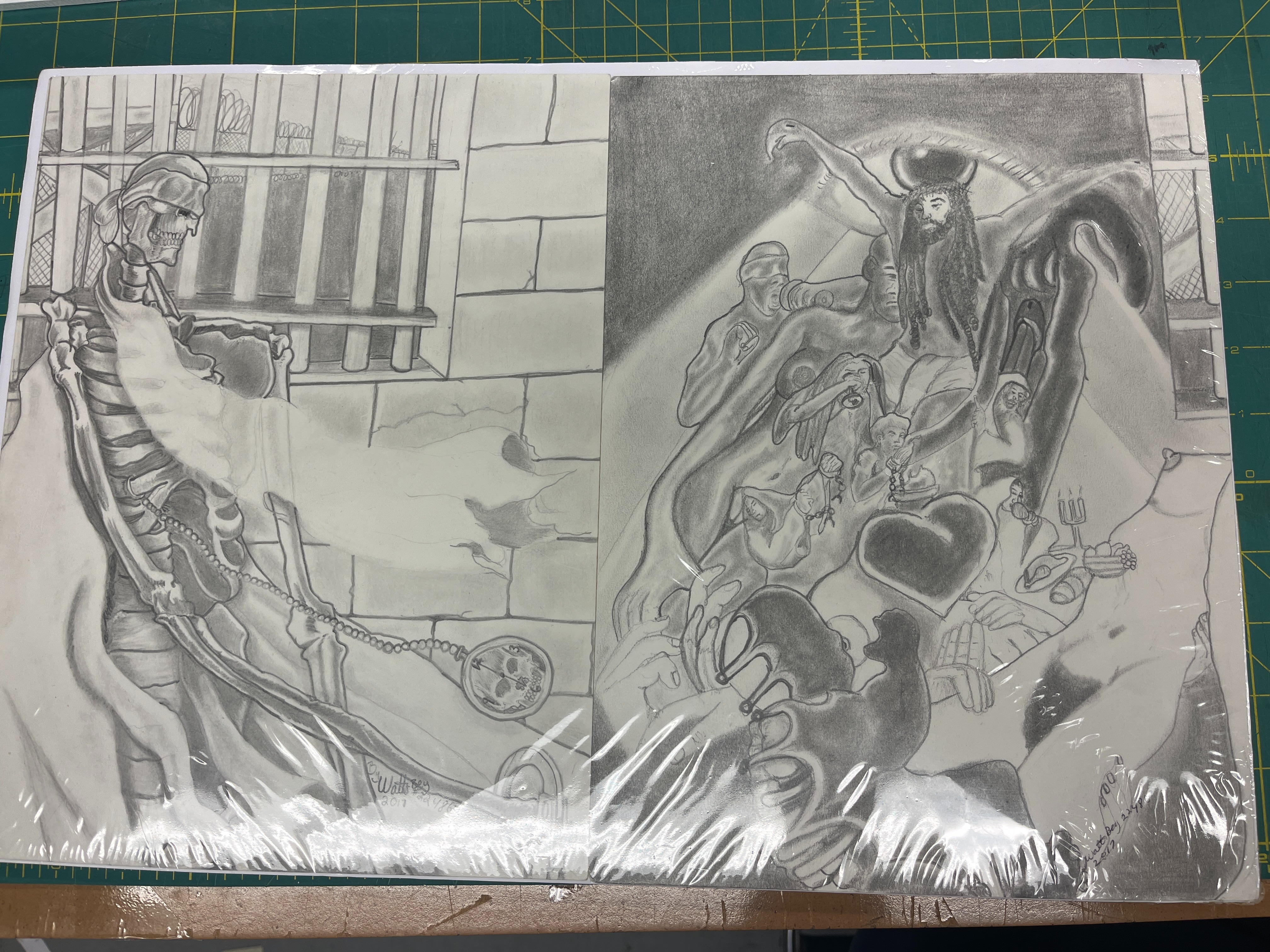 - Christian imagery, pencil, drawing, skulls, symbolism