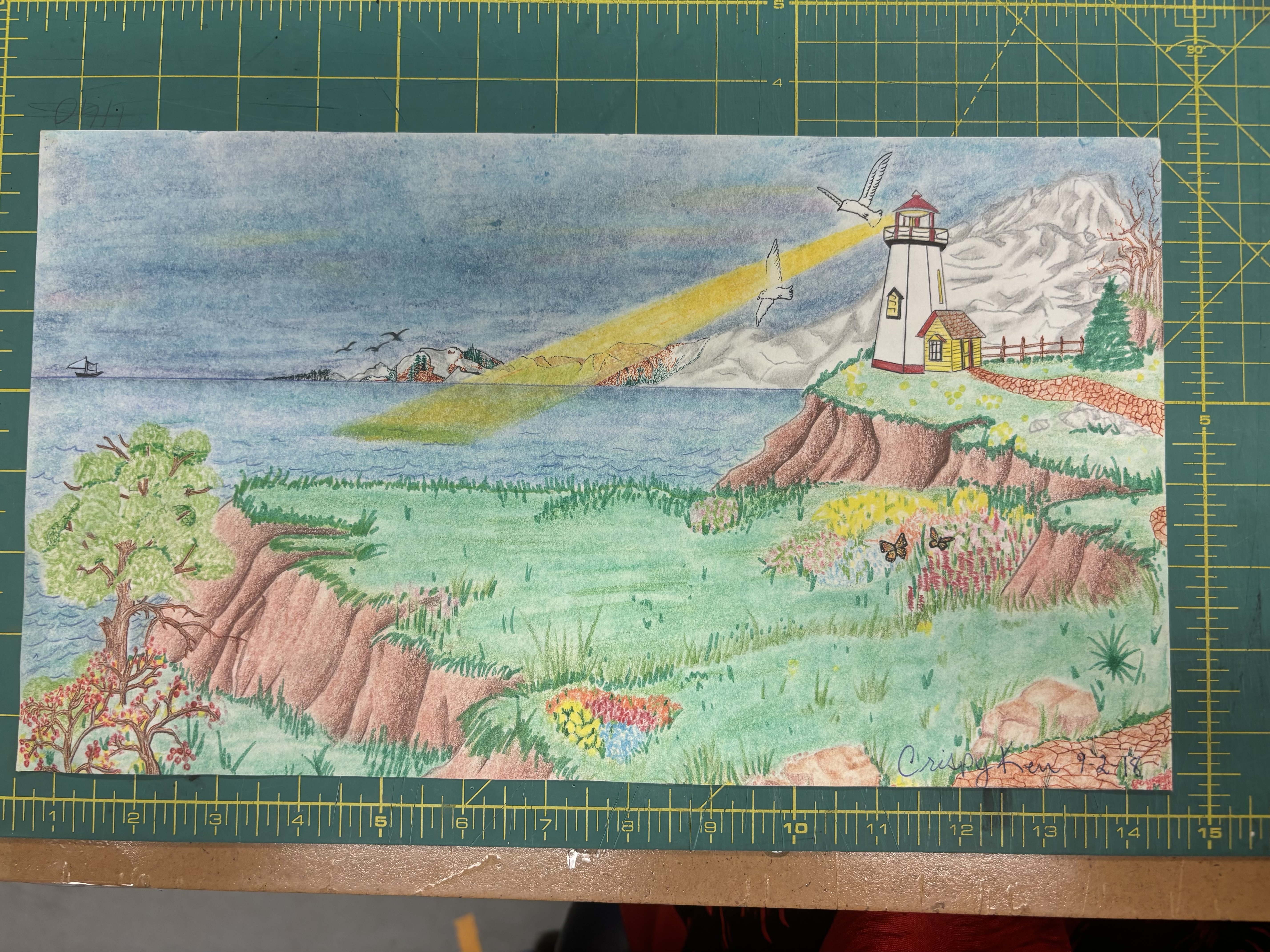 - drawing, colored pencil, two dimensional, representational, nature, landscape, lighthouse, animals, nature, marker, pen