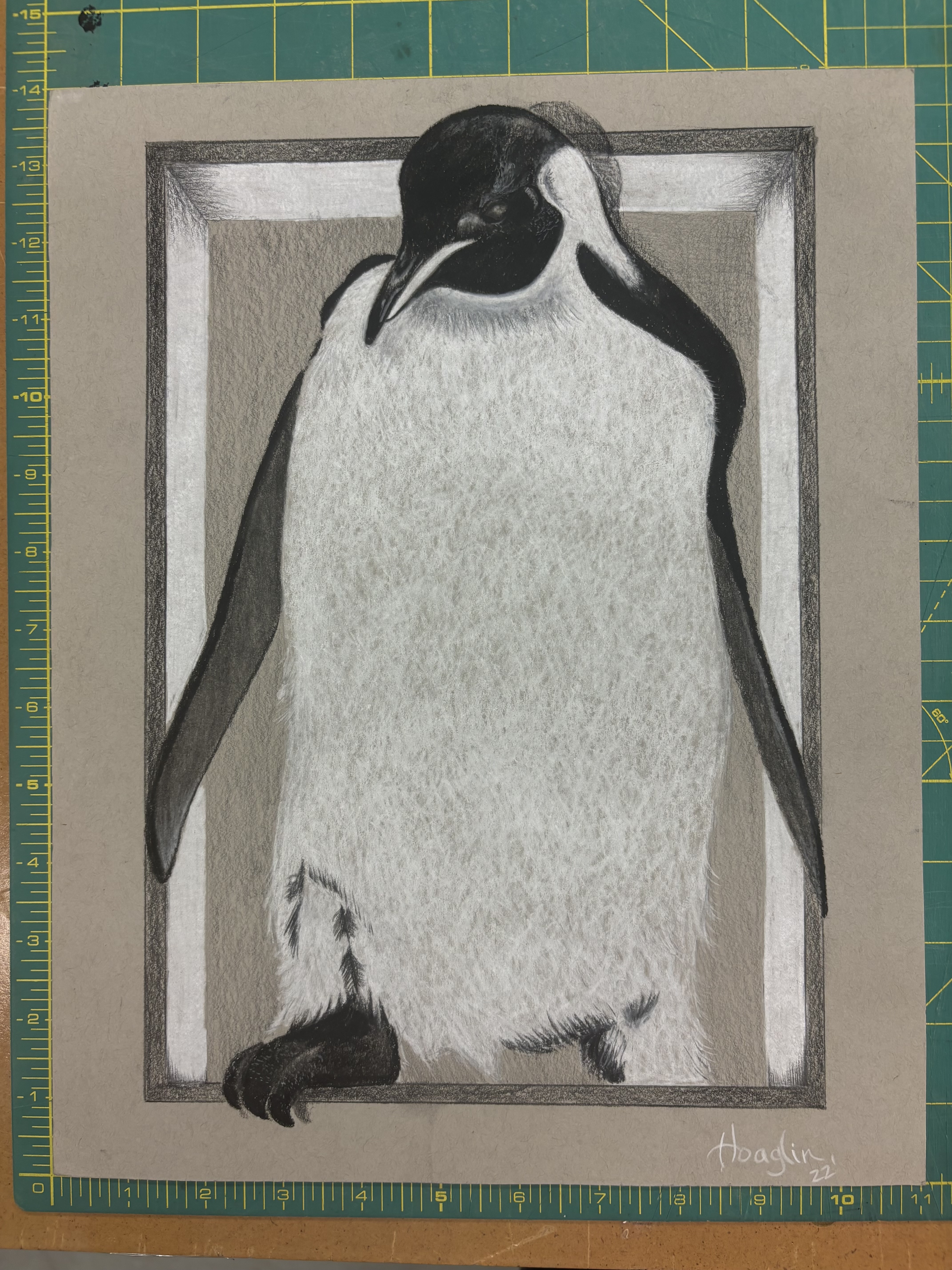 - Emperor penguin stepping out of a black and white frame