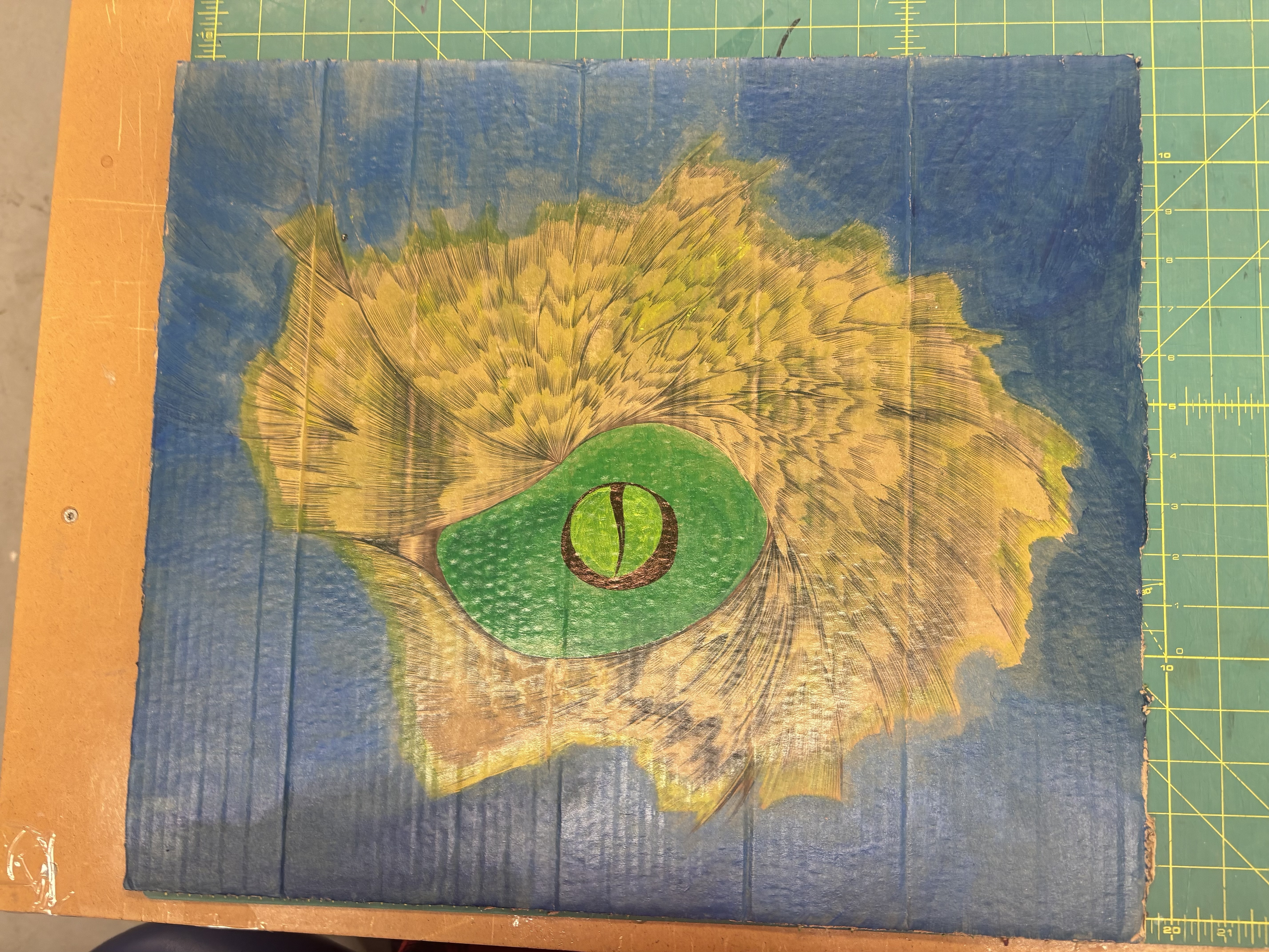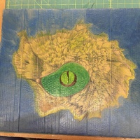 - side 1 - landscape with tower and body of water, side 2 - green animal eyeball surrounded by feather pattern
