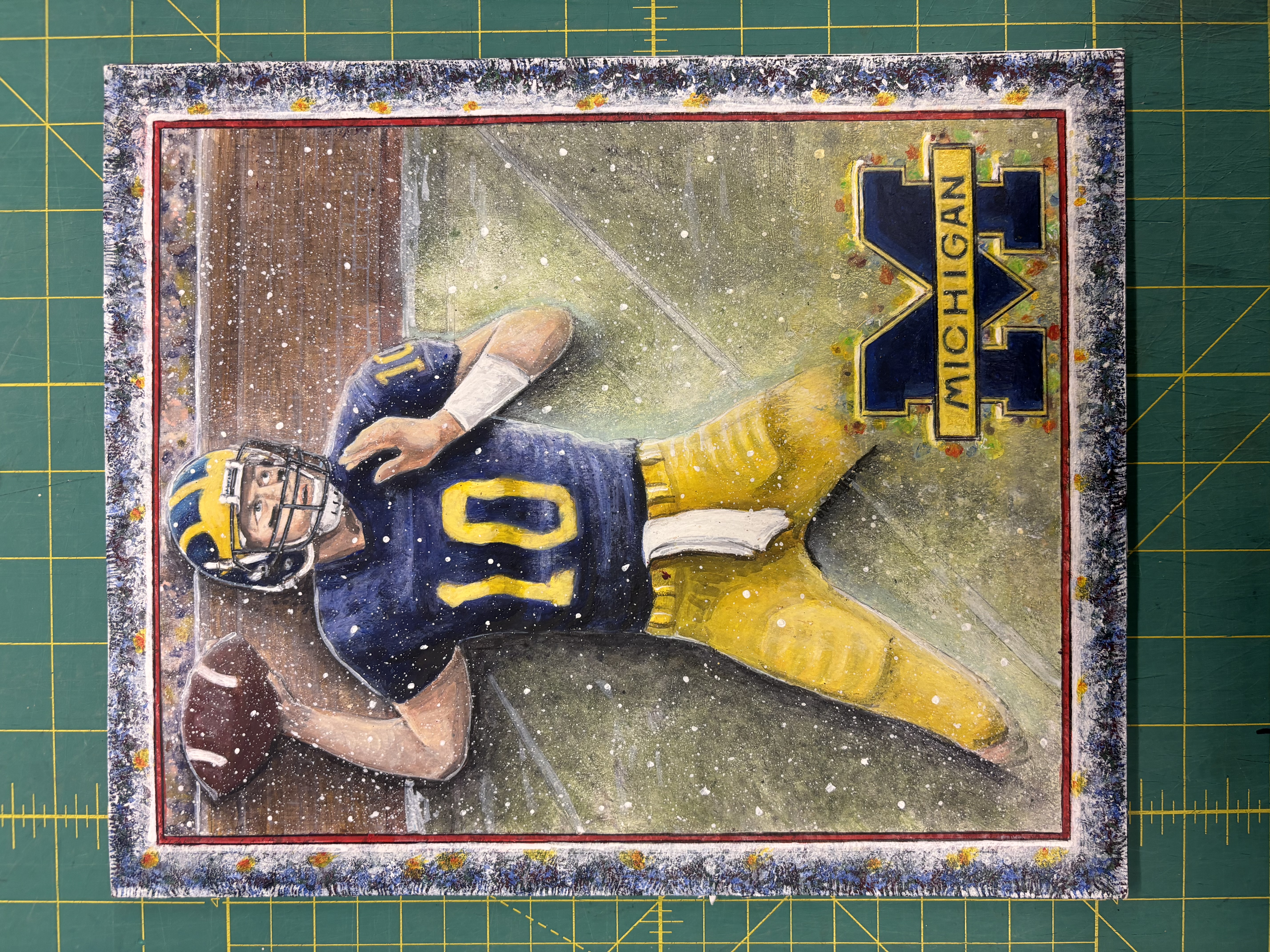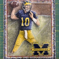 - michigan football player #10 about to throw a football with michigan logo in bottom right corner with a frame