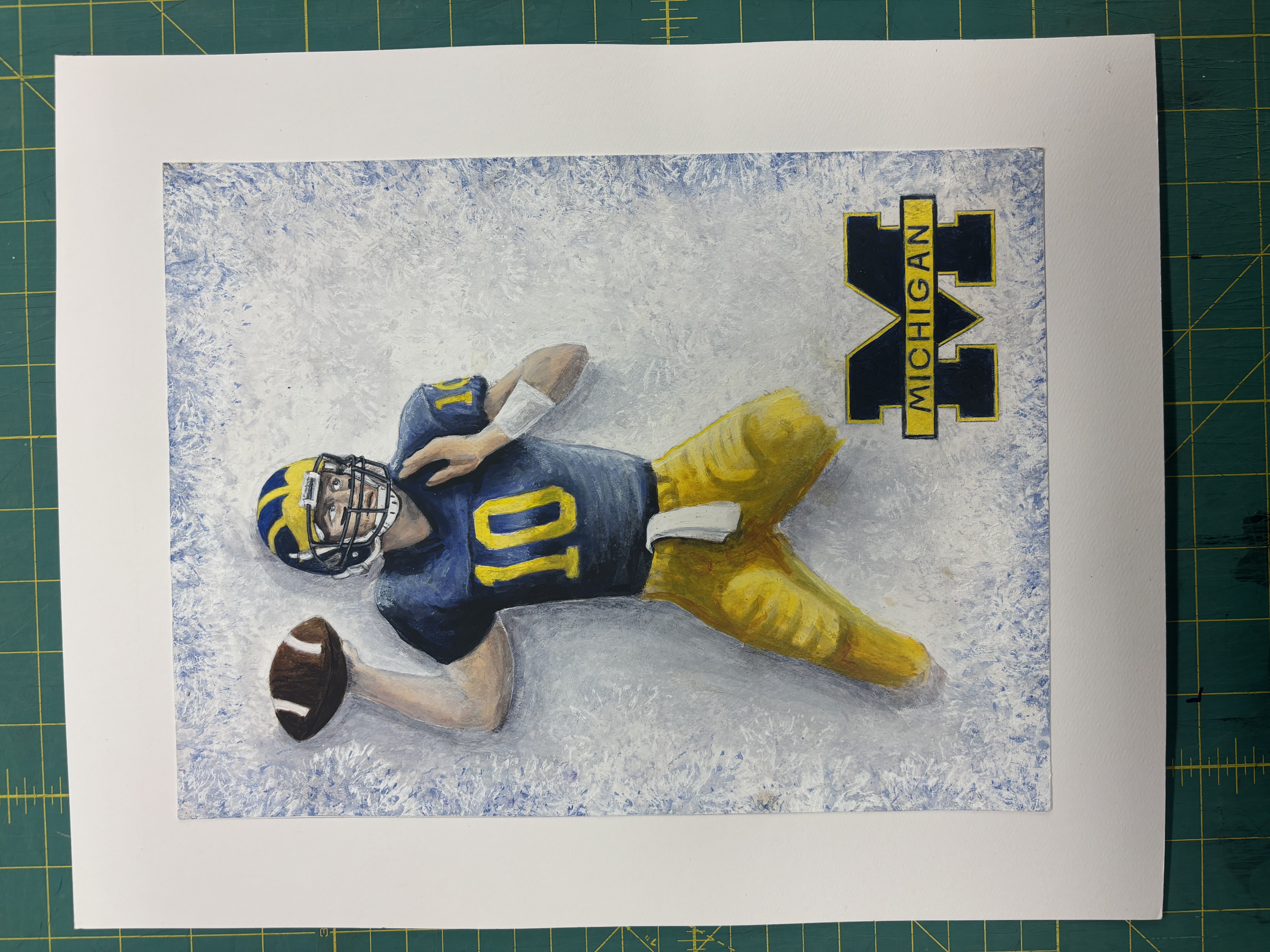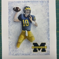 - michigan football player #10 about to throw a football with michigan logo in bottom right corner on a white background