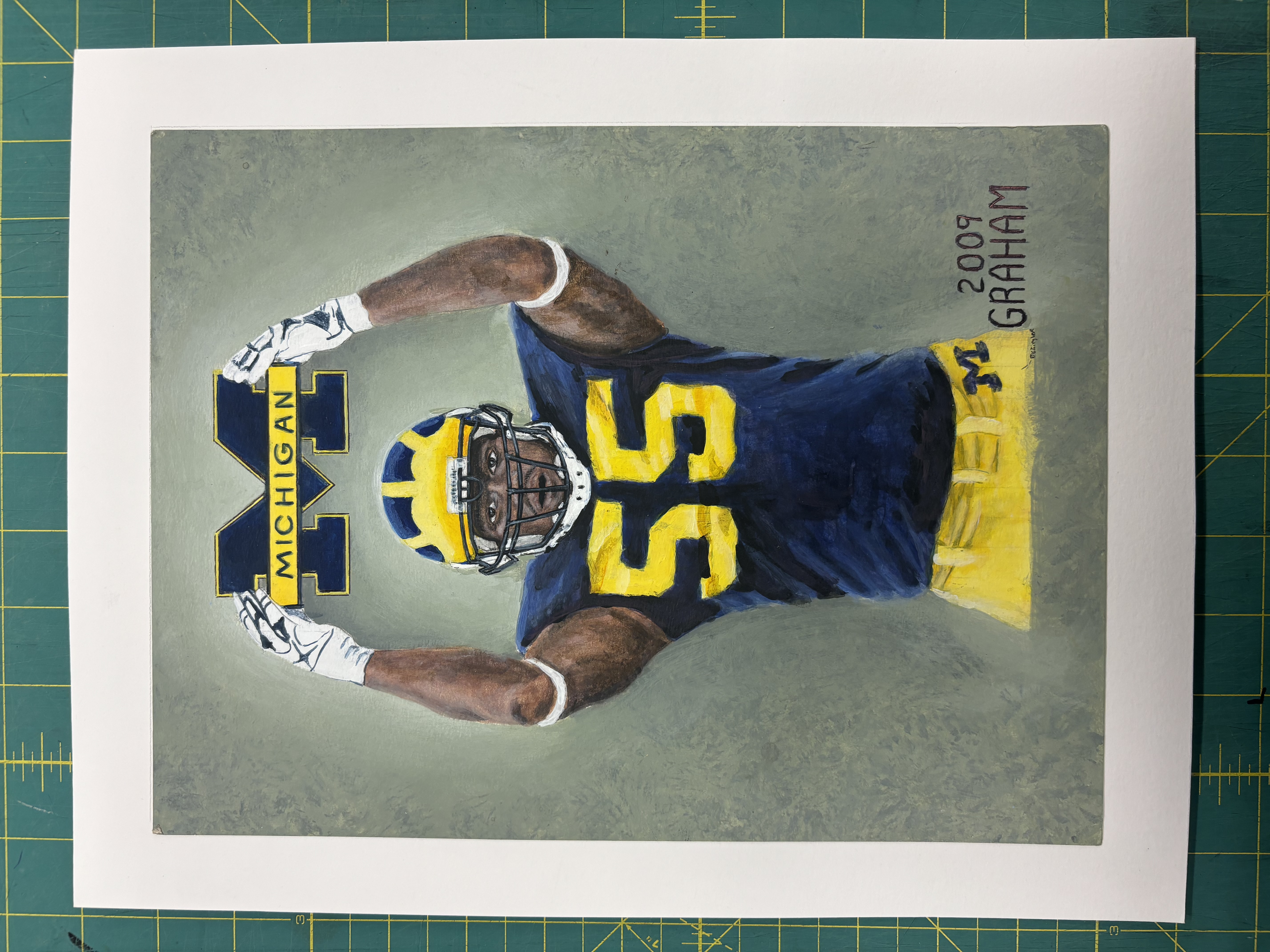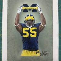 - michigan football player #55 holding up michigan logo with '2009 GRAHAM' in bottom right corner