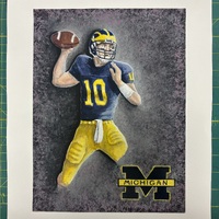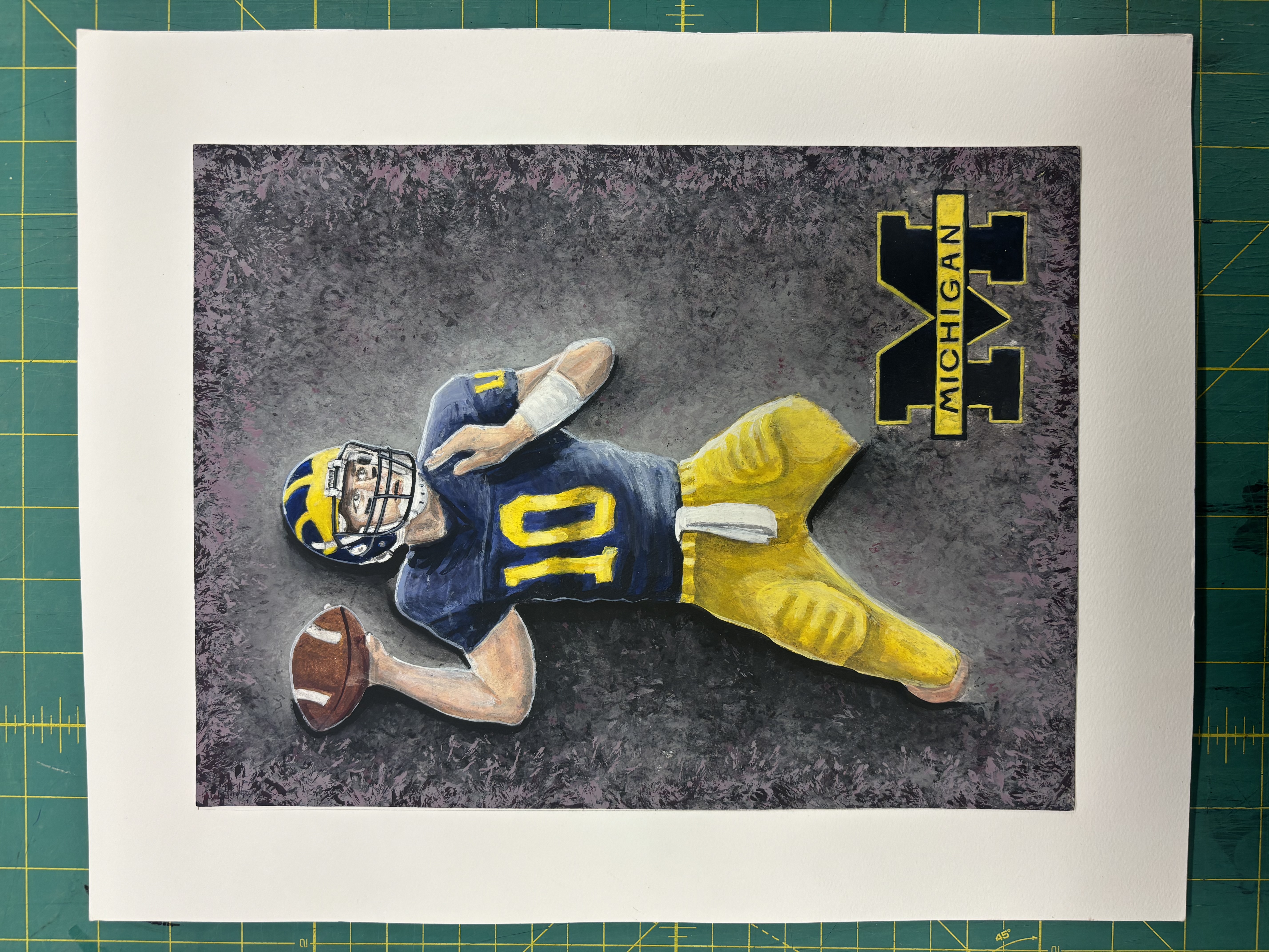 - michigan football player #10 about to throw a football with michigan logo in bottom right corner on a purple background