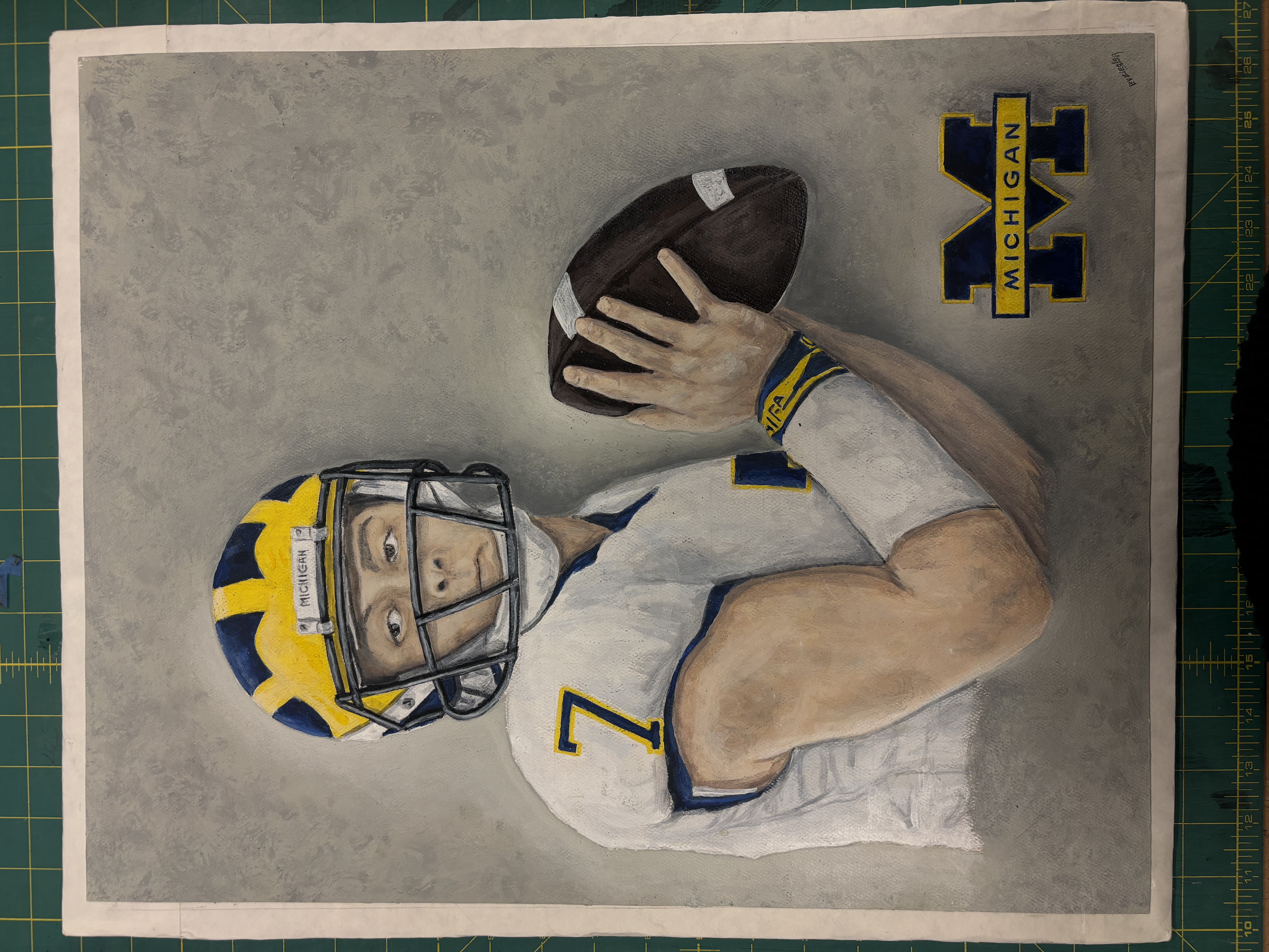 - michigan football player #7 holding a football with michigan logo in bottom right corner