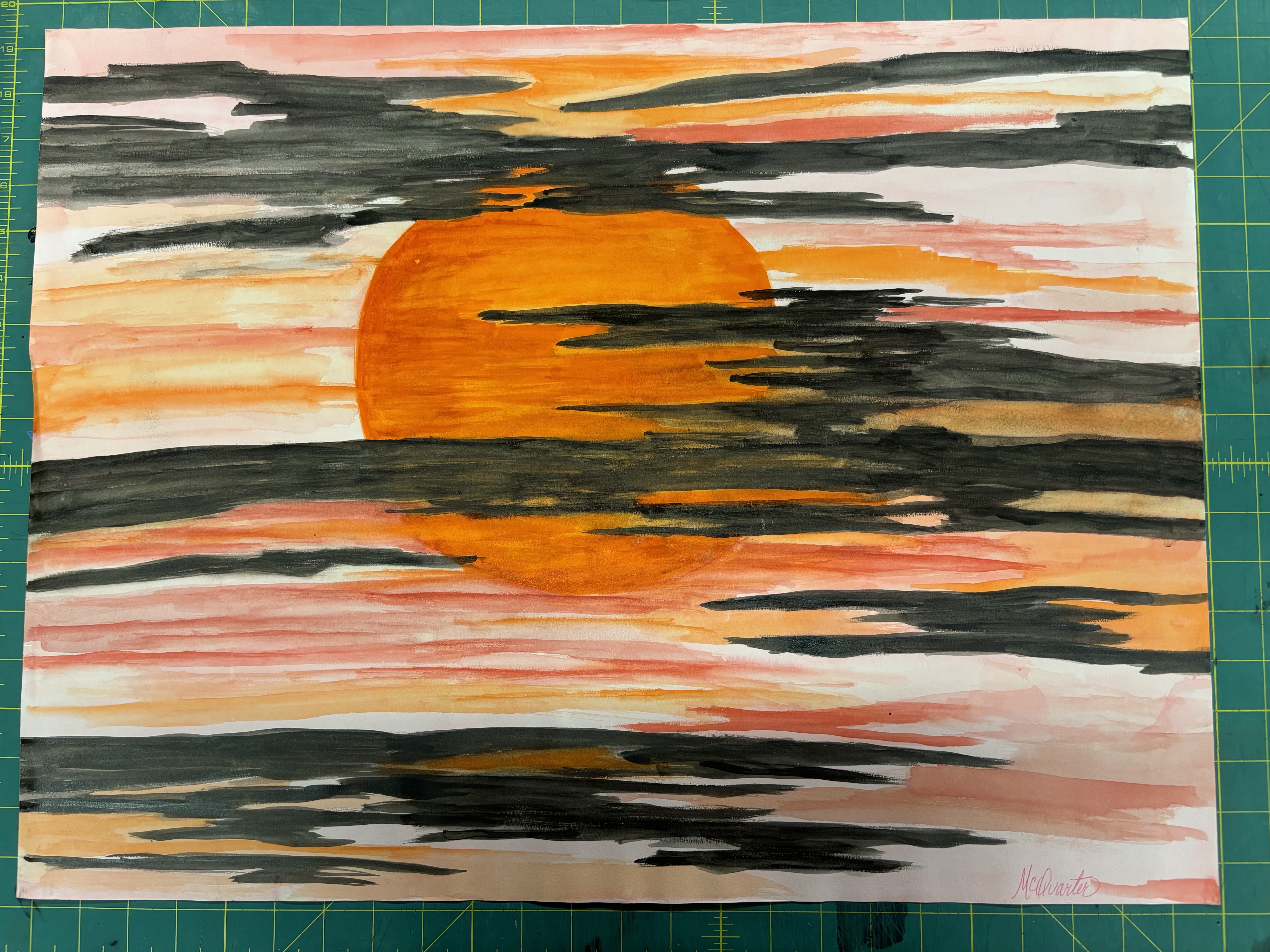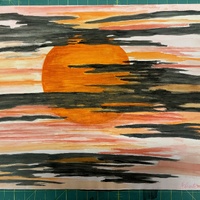 - sun behind black, orange, and pink clouds