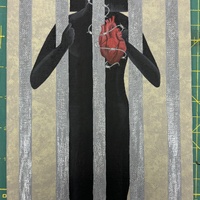 - black sillouette of a woman standing behind bars - her brain and heart are attached to the bars with barbed wire