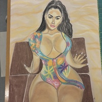 - woman with long black hair wearing a multicolored one piece bathing suit sitting on a lounge chair