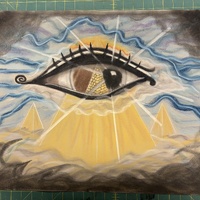 - eyeball with a pyramid in it and three pyramids in the background with blue and black background