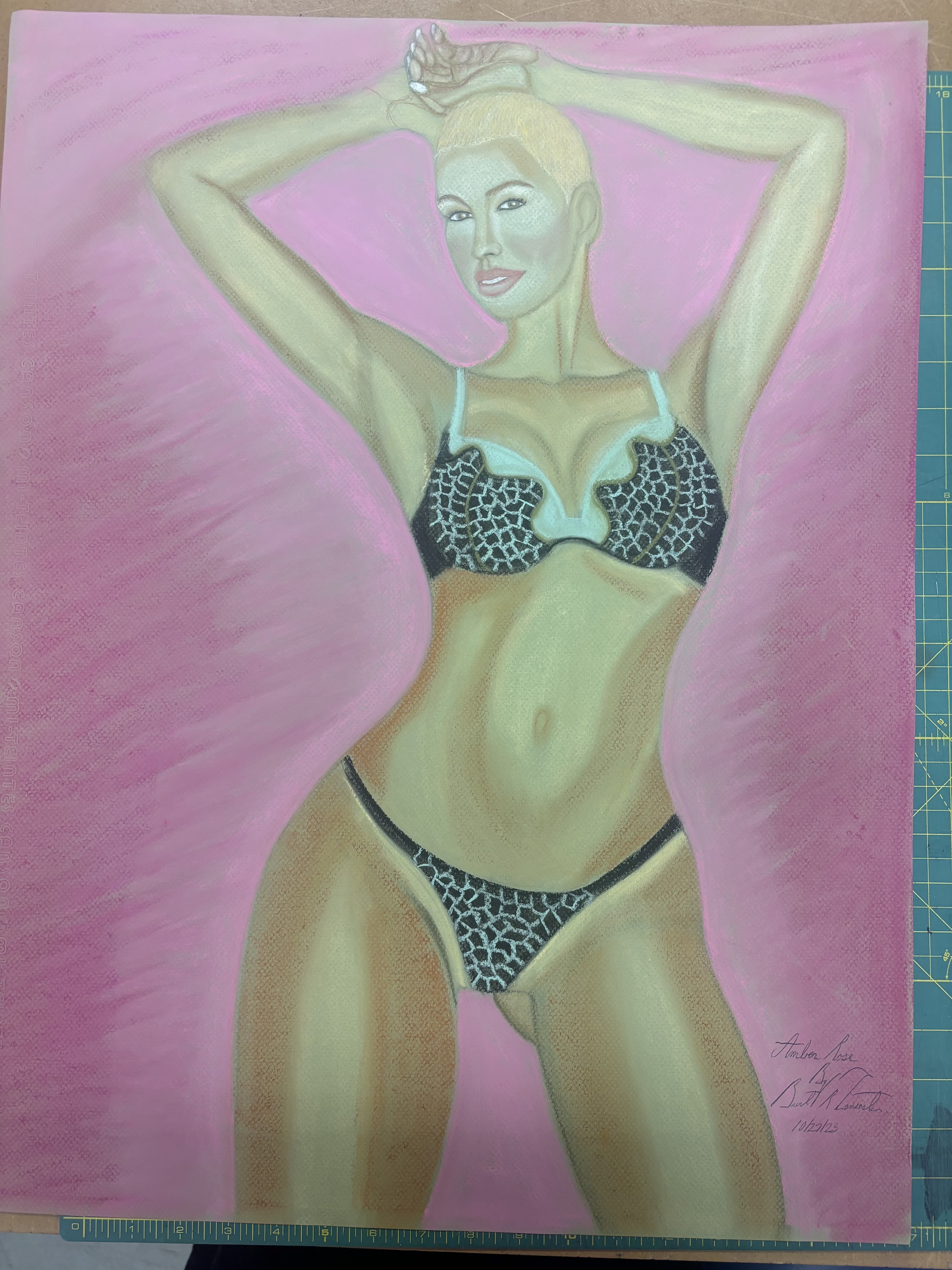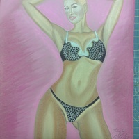 - Woman with blond dyed buzz wearing a black bra and underwear set on a pink background