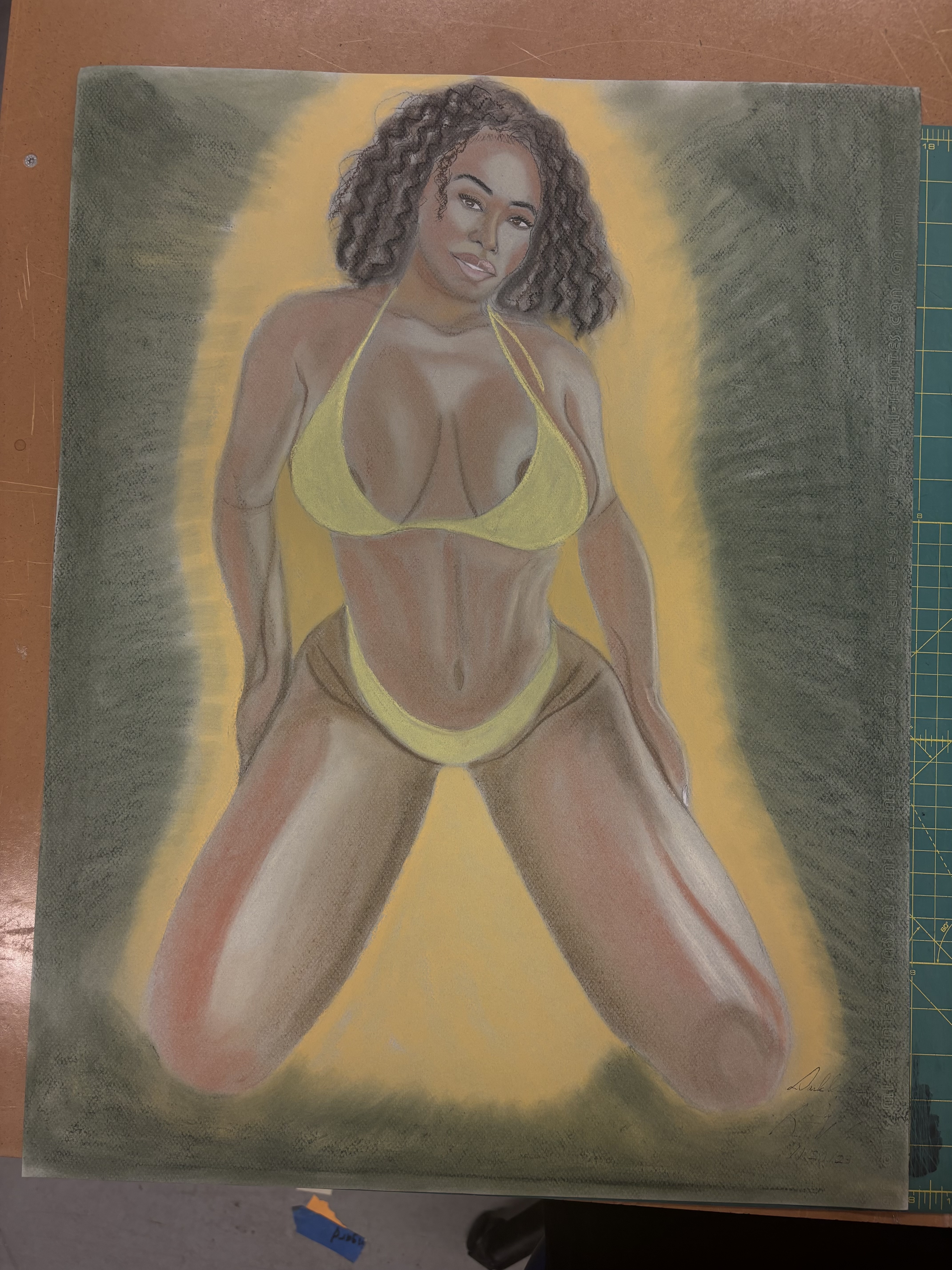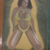 - Woman with short curly hair kneeling in a yellow two piece bikini surrounded by a yellow glow on a green background